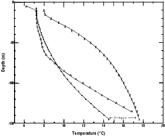 Slow water flow rates in large scale aquifer systems generate a characteristic set of temperature-depth curves. The recharge regions have temperature curves concave toward the temperature axis, while the upflow regions of the system have temperature curves convex toward the temperature axis. The extent of curvature depends on the depth and size of the aquifer circulation.