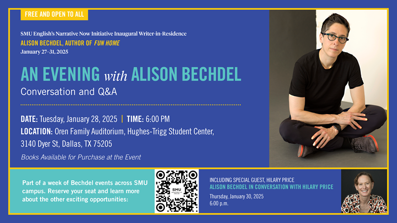 The Department of English at Southern Methodist University is proud to announce that Alison Bechdel, one of the world’s most influential cartoonists and graphic memoirists, will serve as a Writer-in-Residence for Narrative Now, an English Department initiative dedicated to exploring literary arts and storytelling in their many forms. The week-long residency, taking place January 27–31, 2025, offers the SMU community an unparalleled opportunity to engage with Bechdel’s groundbreaking work, which has redefined the graphic novel and broadened literary imagination.