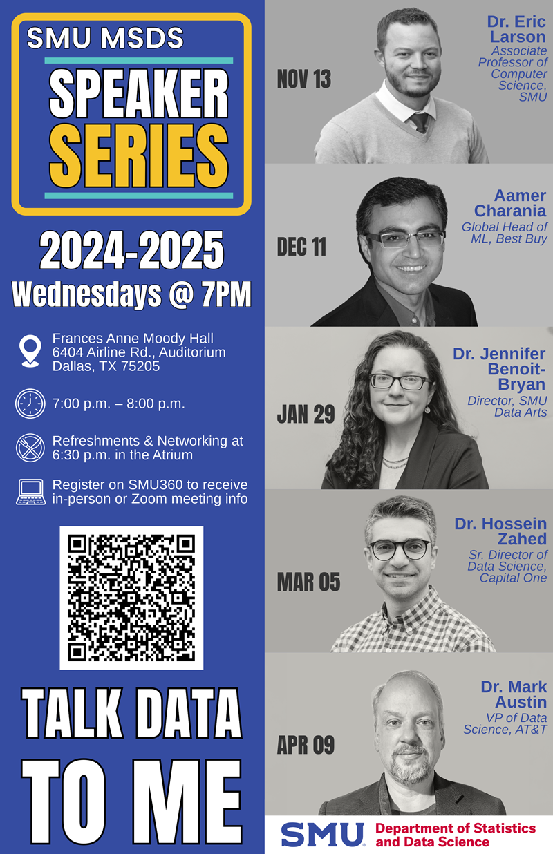 The second season of the MSDS Speaker series showcases five incredible titans in the industry, speaking on various topics across the data science spectrum, including academia, aviation, the arts, and rapidly-changing generative AI. The 2024–2025 lectures will occur on Wednesdays at 7:00 p.m. (central time) at the Frances Anne Moody Hall Auditorium. They will also be broadcast on Zoom, for all of our students who reside outside of the DFW area. The lectures are FREE. Each lecture will host a networking opportunity and reception at 6:30 p.m. in the Moody Atrium. See below for individual dates. You can register for one or all talks at SMU360.