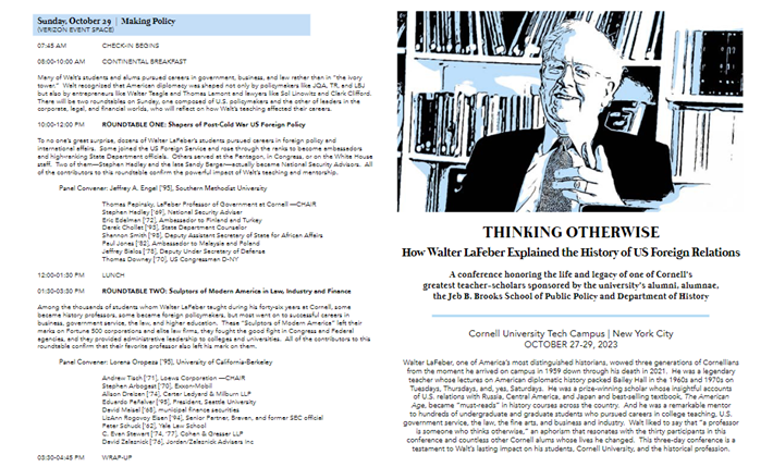 Walter LaFeber, one of America’s most distinguished historians, wowed three generations of Cornellians from the moment he arrived on campus in 1959 down through his death in 2021. He was a legendary teacher whose lectures on American diplomatic history packed Bailey Hall in the 1960s and 1970s and was a prize-winning scholar whose insightful accounts of U.S. relations with Russia, Central America, and Japan and best-selling textbook, The American Age, became “must-reads” in history courses across the country. He was also a remarkable mentor to hundreds of undergraduate and graduate students who pursued careers in a variety of fields and industries. Walt liked to say that “a professor is someone who thinks otherwise,” an aphorism that resonates with the thirty participants in this conference and countless other Cornell alums whose lives he changed. This three-day conference is a testament to Walt’s lasting impact on his students, Cornell University, and the historical profession.