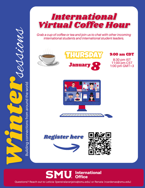 Please check your SMU email and follow The International Office Instagram for more information about upcoming events and activities. If you have ideas or would like to connect about future events, please contact IO at intloffice@smu.edu.
