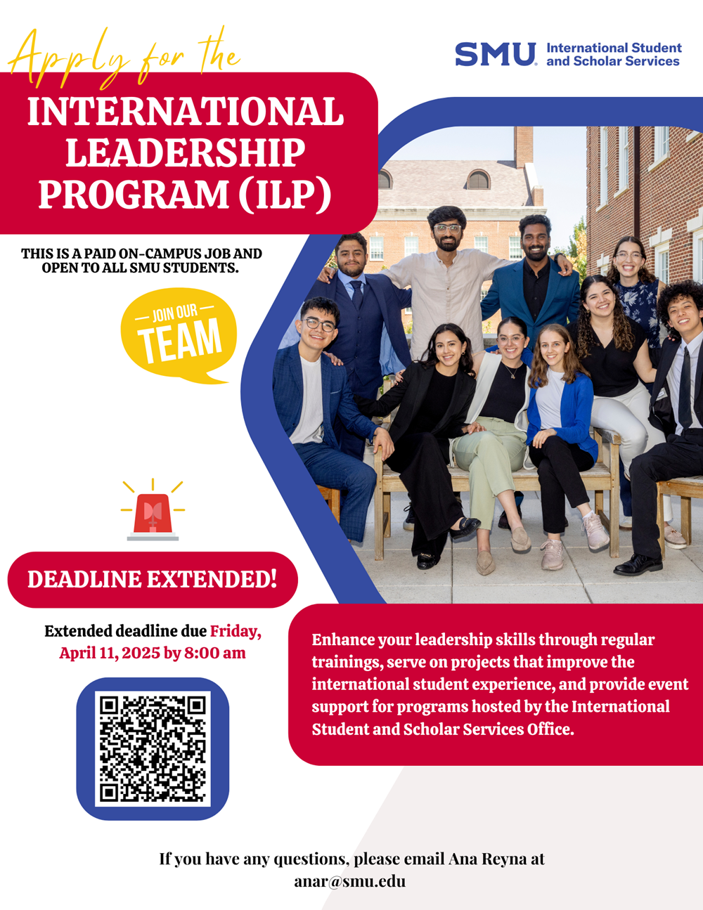The International Leadership Program is designed for students looking to enhance their leadership, communication and teamwork skills. It provides opportunities for your professional development while serving the SMU community and the global community. It is open to ALL SMU students - domestic, international, graduate and undergraduate.