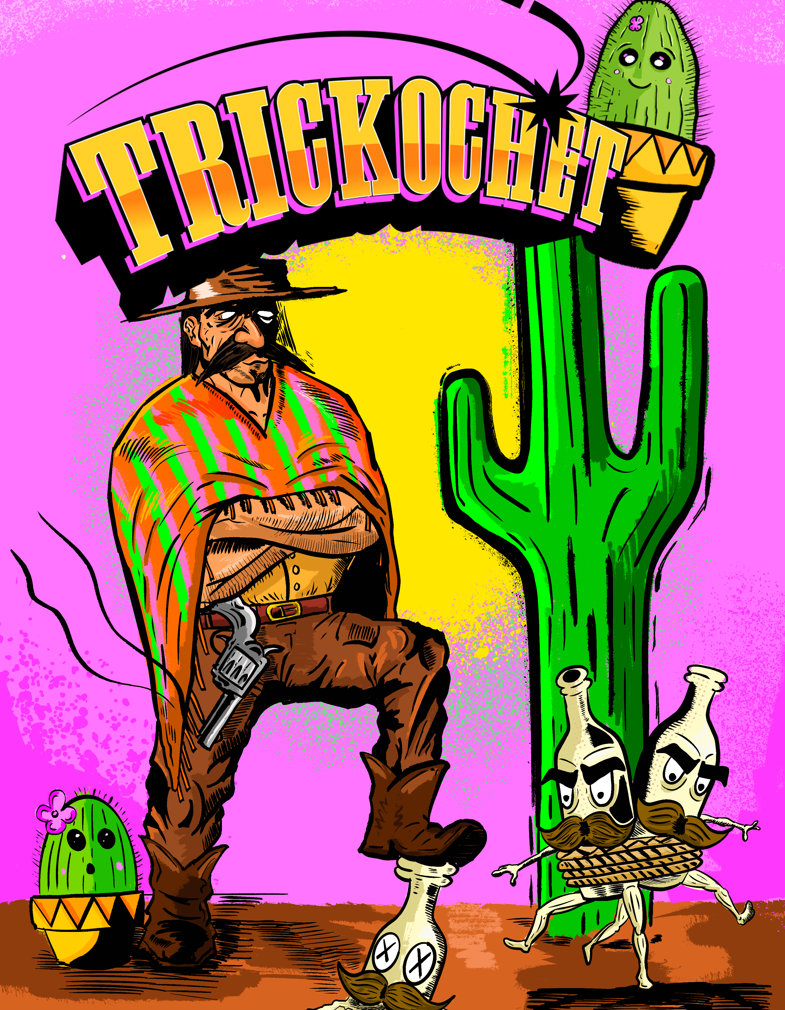 Trickochet is a top-down puzzle game in which the player controls Pancho, a quick-shooting gunslinger, in a quixotic adventure where he faces off against a gang of sentient bottles and cacti, while protecting his own cactus friend, Sancho. Player’s aim to ricochet a limited number o? f bullets using a wide array of “ricochet-able” objects, such as metallic tables, longhorn skulls, and brick walls. In each level, the player’s goal is to eliminate all the enemies and gain a high score based off the number of ricochets, the number of enemies killed, and the number of stars picked up.