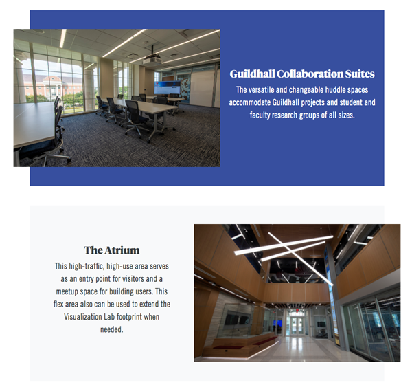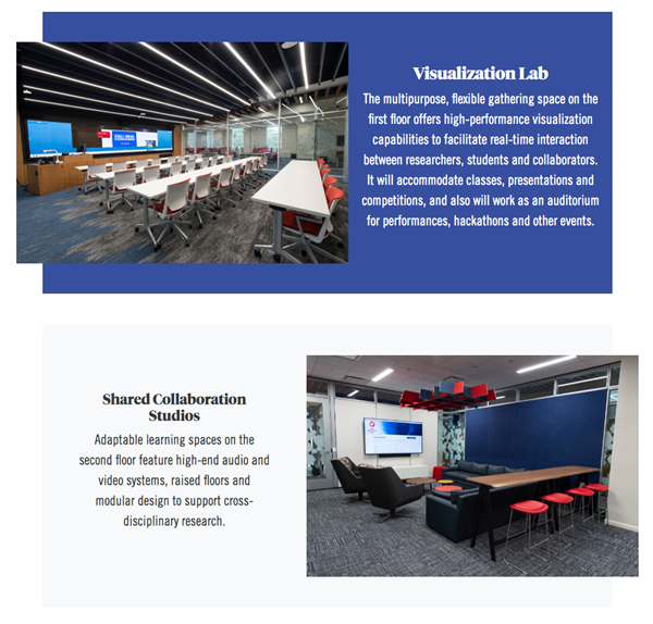 Online and remote learning is part of the fundamental design of Ford Hall, and spaces are equipped with smart cameras that track who is speaking and multiple AI-powered microphones that triangulate sound for remote viewers to clarify voices from both students and faculty. Ford Hall also contains a game streaming booth for students to build and interact with an online community around their game.