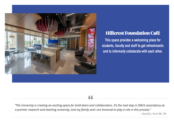In addition to being able to enjoy the many luxuries of a major university at their fingertips like the student library and dining spaces, our location in Ford Hall affords us close proximity to unique SMU campus labs and resources, including: