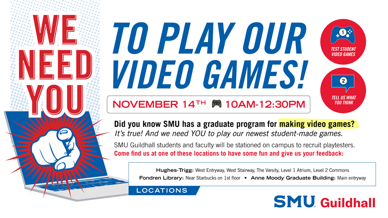 SMU graduate students and faculty will be stationed on campus to recruit YOU as a playtester to provide your feedback.