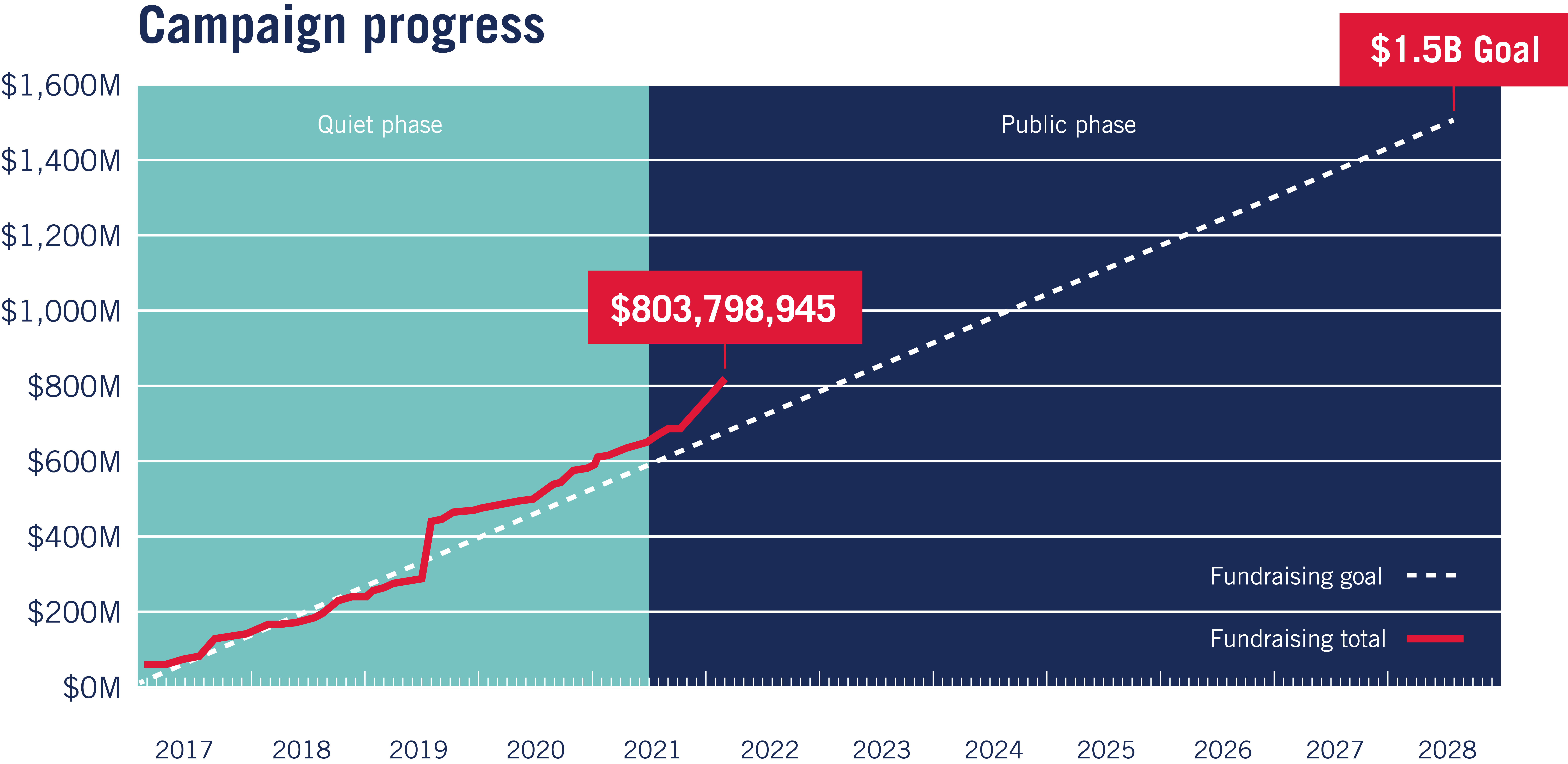 Publicly launched in September 2021, SMU Ignited: Boldly Shaping Tomorrow has already garnered groundbreaking support from the Mustang community. With over $800 million raised as of February 2022, the campaign is primed to reach its goals of empowering outstanding students, enriching research and teaching, and enhancing our campus and community for future generations.