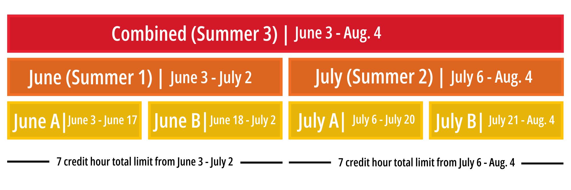 Students taking multiple Summer courses may enroll in classes scheduled in any of the sessions, but as a rule, they should not enroll in more than 7 credit hours in the month of June & 7 credit hours in the month of July.