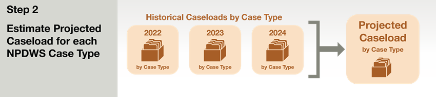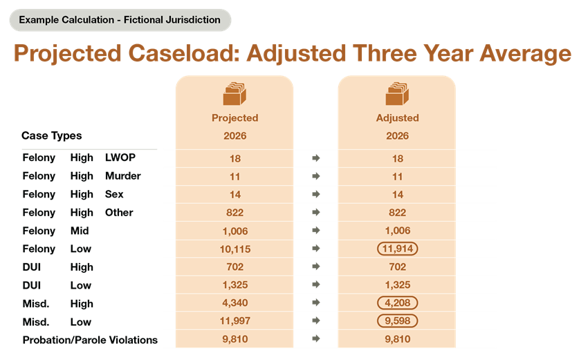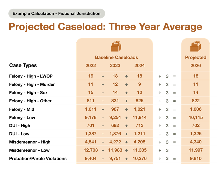 A simple way to project next year’s caseload is to average the past few years of caseload data for each case type. When an average is recalculated, year after year, using the most recent years’ data and dropping the oldest year from the previous calculation, it is called a moving (or rolling) average. Using a moving average, instead of the most recent year’s caseload data, reduces the influence of outlying values or one-time events. Many state court systems use a three-year or five-year moving average to project caseloads and calculate the need for judges and court staff.