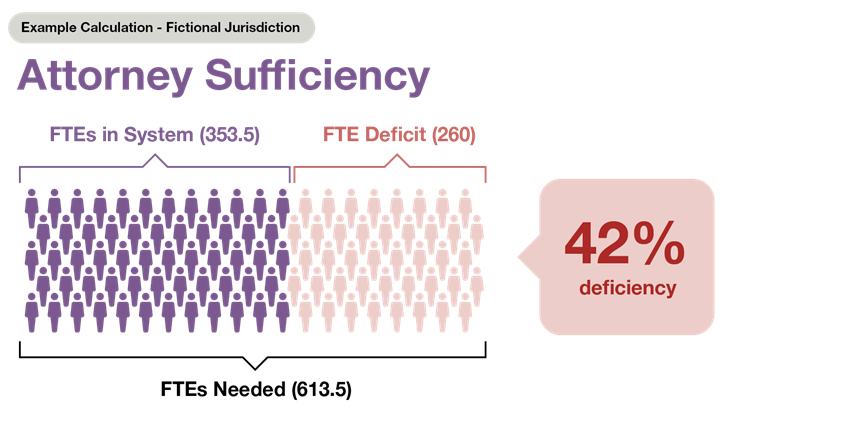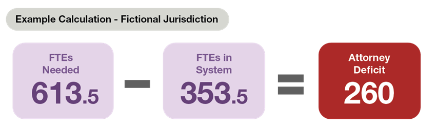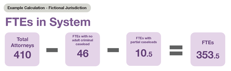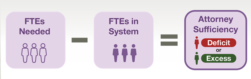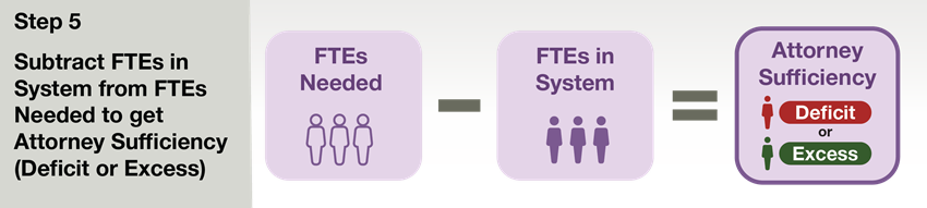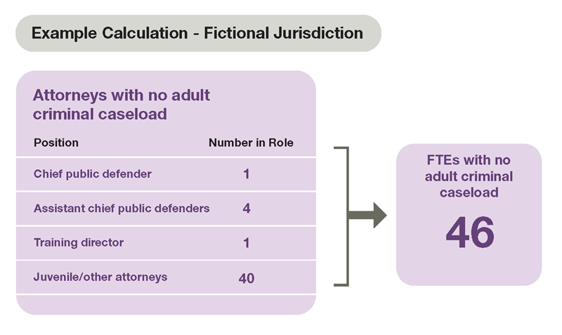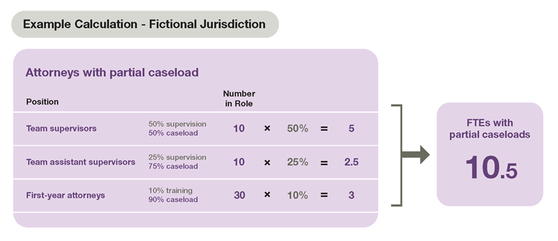 The public defense provider needs to understand the number of FTE attorneys available currently in their system to handle the caseload. This sounds simple, but it can be complicated. Most providers have some attorneys who do not carry a caseload and others who have only partial caseloads. These are often attorneys with supervisory or training responsibilities.Other provider attorneys might have responsibility for cases excluded from the caseload addressed. For example, as noted previously, the NPDWS only addressed criminal cases in adult court. Most public defense providers also represent people in juvenile delinquency proceedings. Some public defense providers represent people in civil commitment proceedings or dependency proceedings.