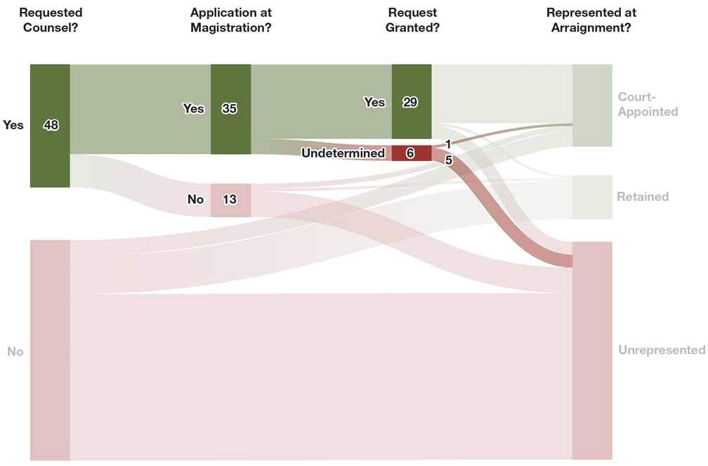 3: Request Granted? If a file included a day-of-magistration application for appointed counsel, researchers recorded whether officials granted or denied the request. Researchers coded cases as “undetermined” if there was no indication of whether or how a court had ruled. This column does not depict outcomes of applications that post-dated a person’s magistration.