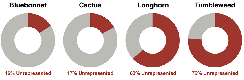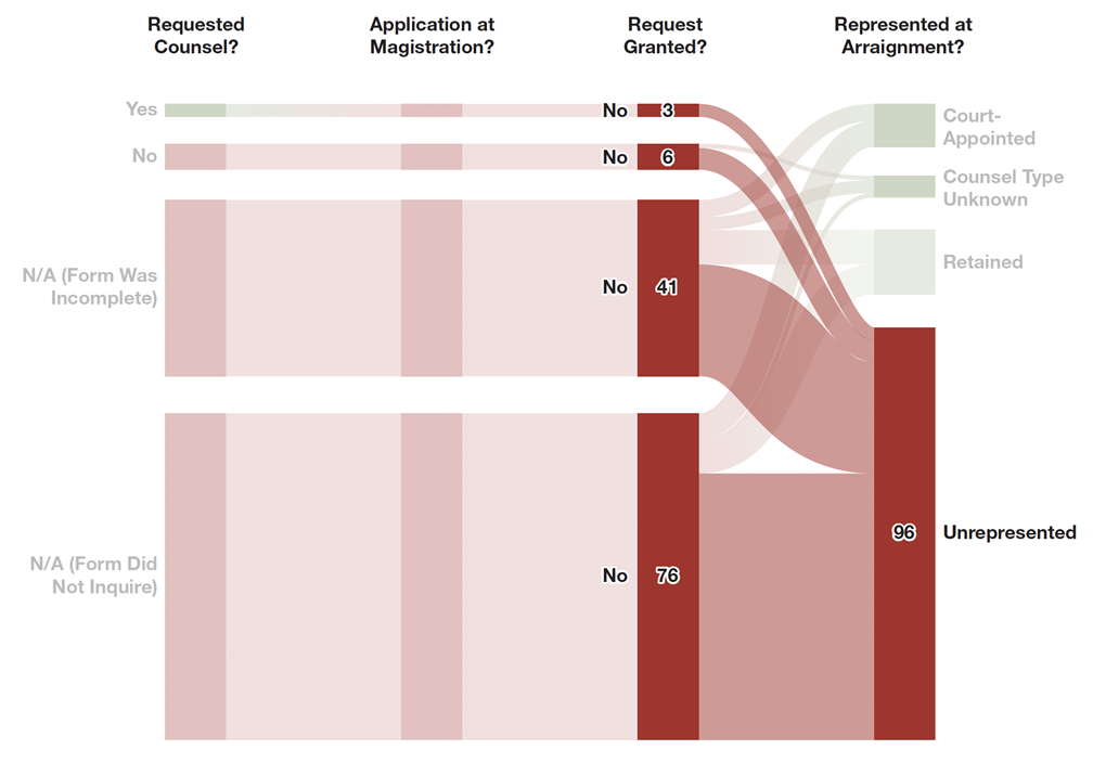 In most (76) Tumbleweed misdemeanor cases, the magistration forms did not even ask the presiding JP to record whether a person wanted to apply for counsel. Among the 50 cases in which the magistration form asked that question, there were only nine cases in which a JP answered it. While three forms indicated that an accused person wanted to apply for counsel, researchers did not find any completed applications for appointed counsel. On the day of their arraignment, accused people in 76% (96) of studied cases still had no attorney, the highest rate in any county studied.