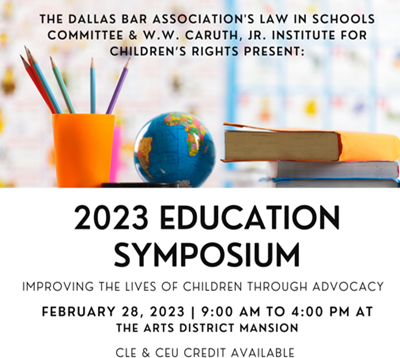 The DBA and the Caruth Institute for Children's Rights Education Symposium is a multidisciplinary gathering of minds on how to improve educational outcomes for young people. Attendees Include educators, school psychologists, attorneys, child welfare specialists, child placement agencies, parents, foster parents, policy makers, community activists, and the young people themselves.