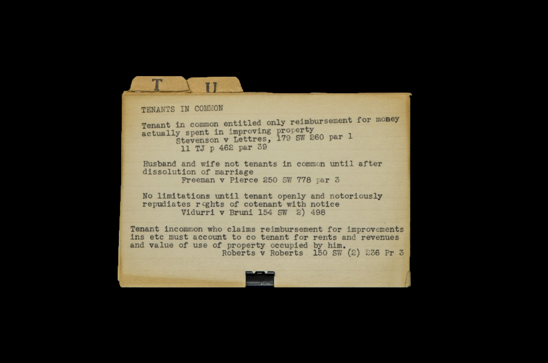 Turner kept an index card file for legal research, with each card summarizing points of law such as “Tenants In Common” and “Adverse Possession.” The index card file provides insight into some of the legal issues Turner frequently addressed in his law practice.