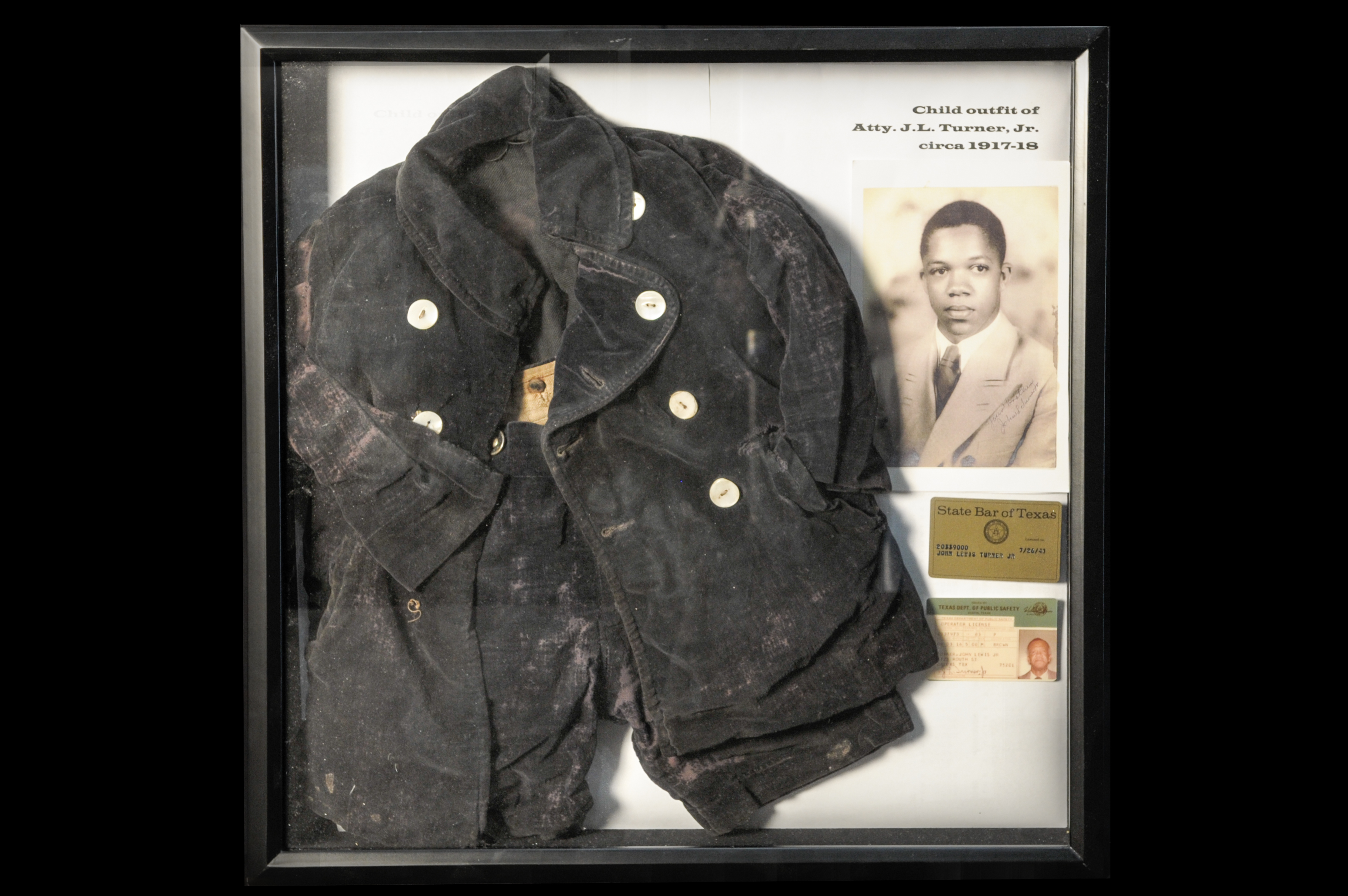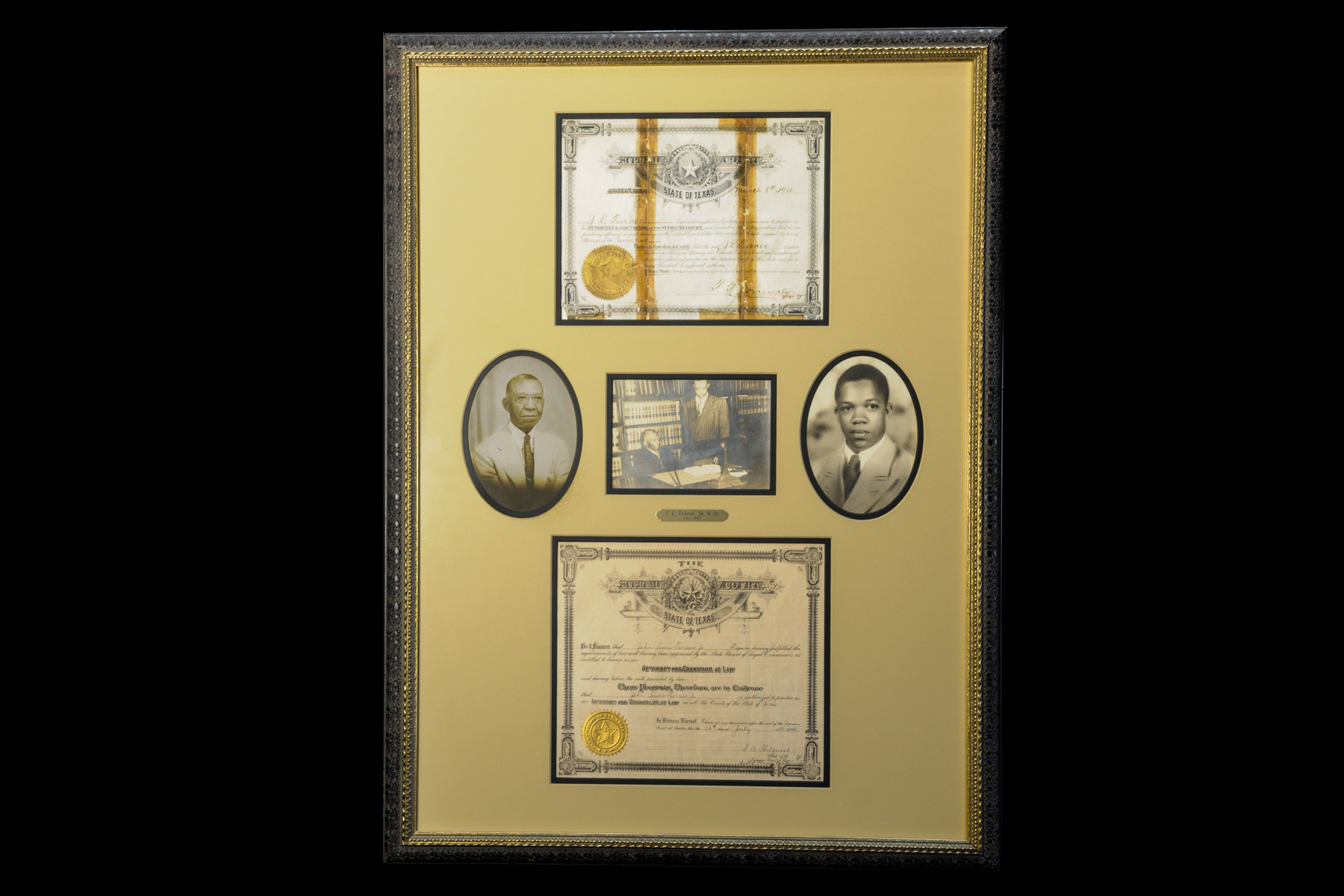 The photograph in the center of this framed montage depicts J.L. Turner Sr. and son J.L. Turner Jr. in the law offices they shared at 1723 Routh Street. The Texas law license certificates of J.L. Turner Sr. and son, as well as their individual photos, also are shown.