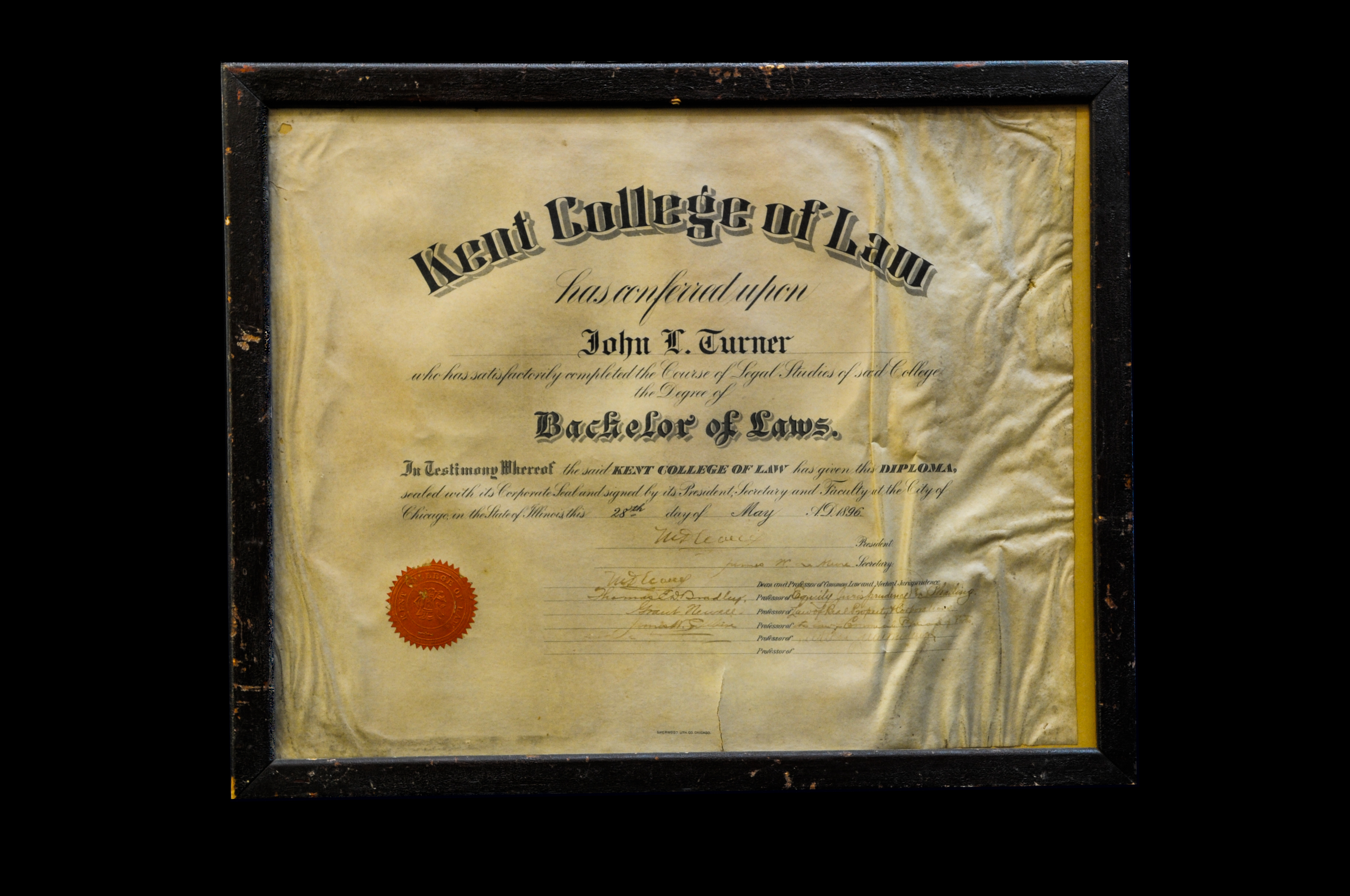 J.L. Turner Sr. received his Bachelor of Laws (LL.B.) degree from the Kent College of Law in Chicago in May 1896.