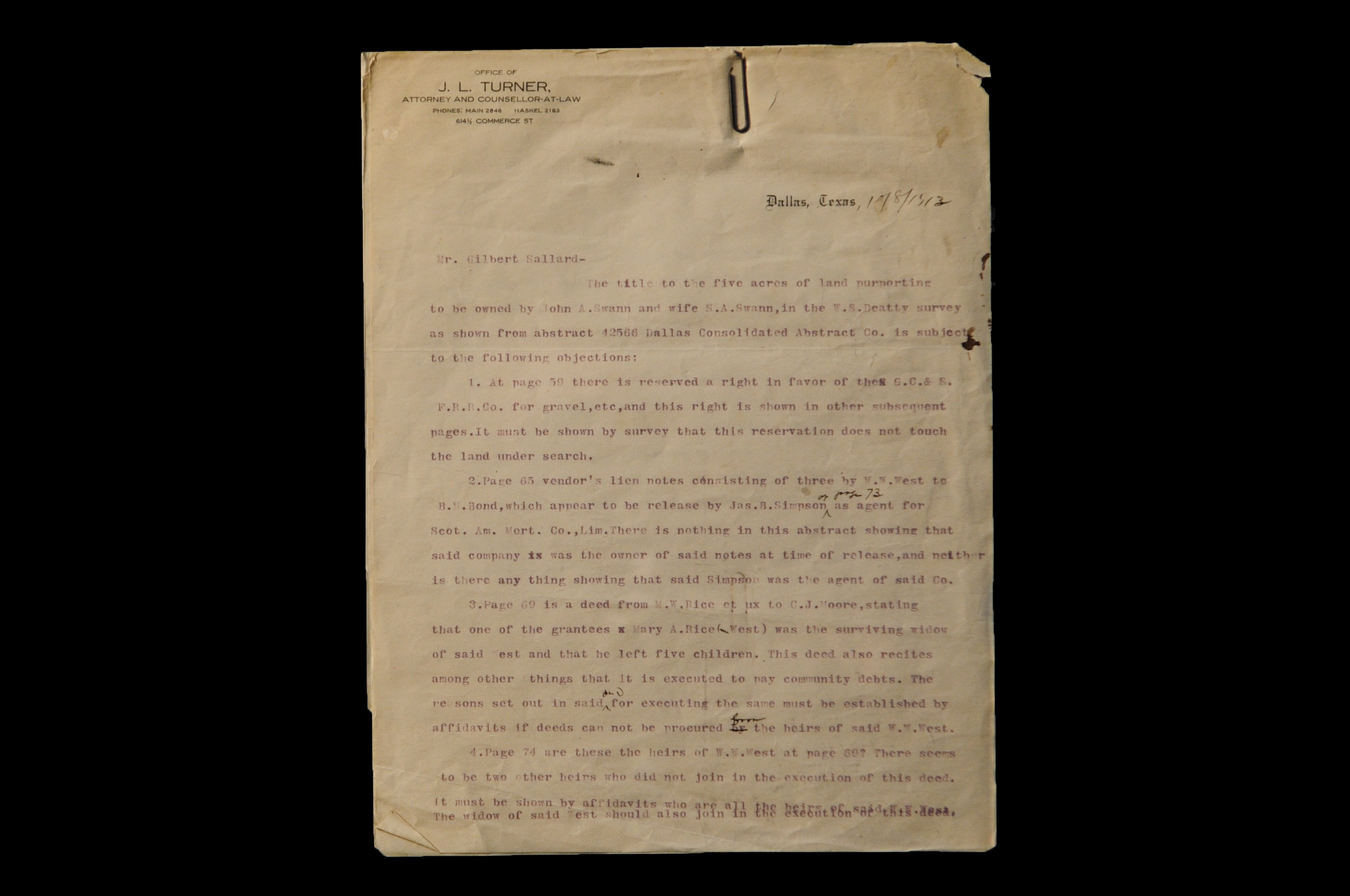 This land title search report from October 8, 1913 is an example of the work product of J.L. Turner Sr. in the area of real estate law. In addition to such title reports, Mr. Turner’s archived files include many briefs filed in civil litigation, among other legal matters which he handled in his law practice.