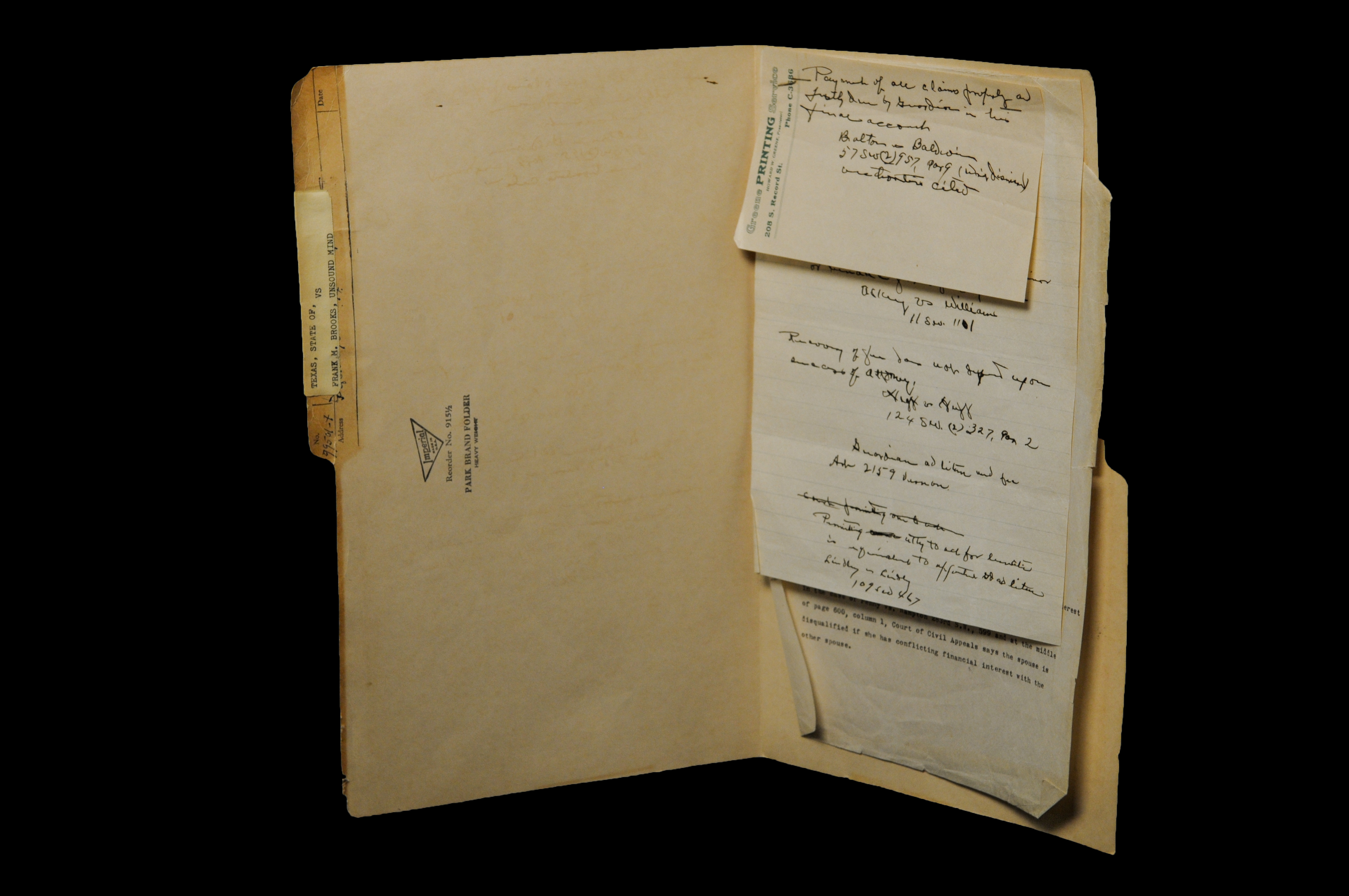 This example is a typical file in the archive of J.L. Turner Sr.’s client files. The file contains, among other documents, a “Brief for Opponent” submitted in the County Court of Dallas County, Texas, which argues in the case of State of Texas v. Frank M. Brooks, Unsound Mind that “[t]he wife is disqualified for guardian under Article 4122, part. 5, Vernon Civil Statutes….The undisputed evidence shows that she is defendant in a suit for damages growing out of her tort now pending in the District Court and that she and her husband own community estate….The undisputed testimony showed that the wife has a conflicting interest with the husband in his separate estate in that they had made improvements on the separate estate out of the community estate.”