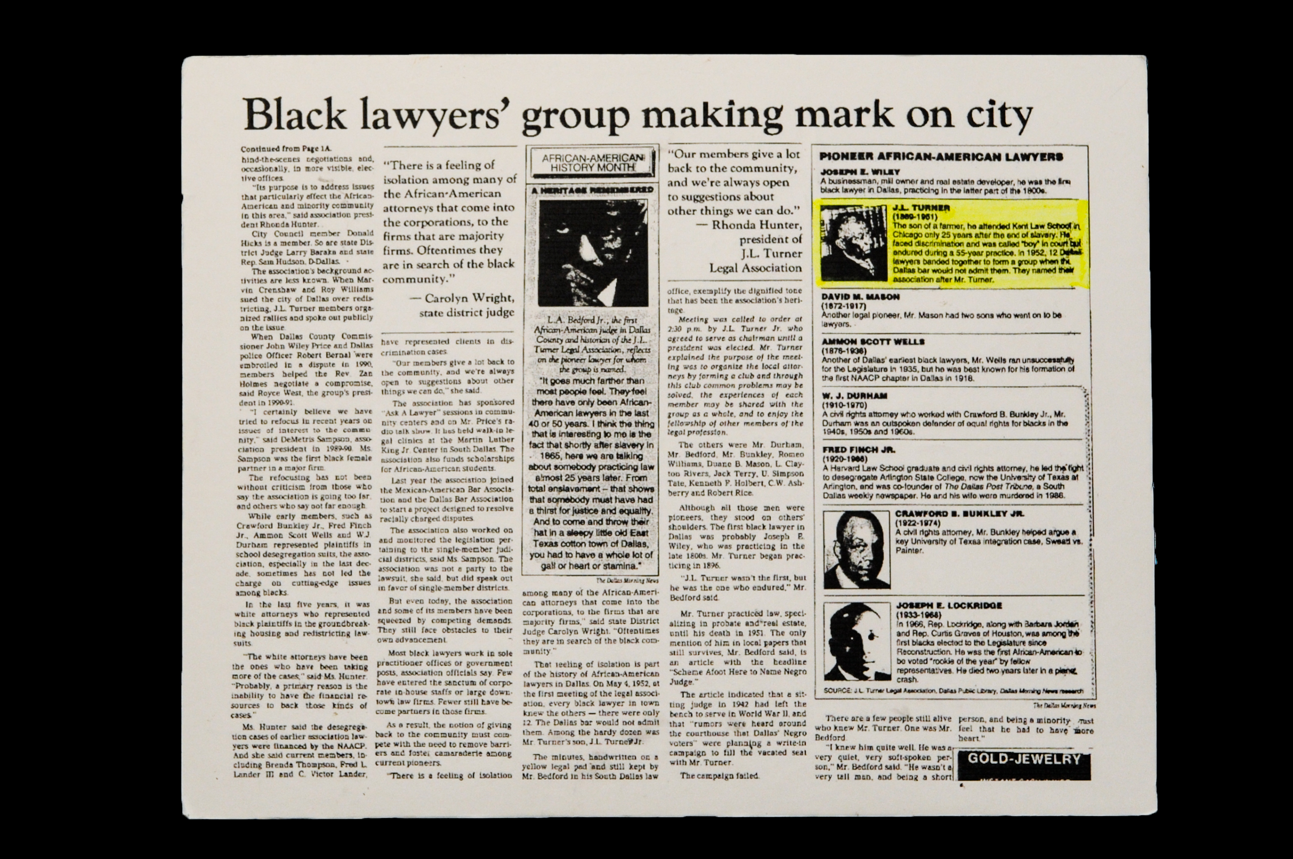 In 1992, the Dallas Morning News recognized the growing influence of the J.L. Turner Legal Association.  This article discussed how the TURNER ASSOCIATION was continuing to address issues that particularly affect the African-American and minority community in this area.  For example, in 1991 the TURNER ASSOCIATION joined with the Mexican-American Bar Association and the Dallas Bar Association to start a project designed to resolve racially-charged disputes.