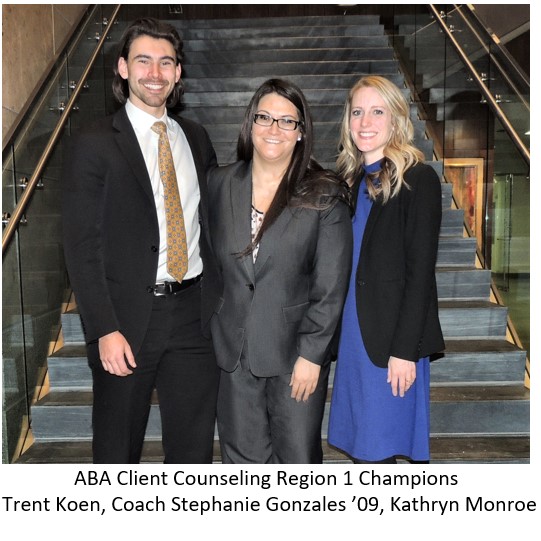 2L Trent Koen and 2L Kathryn Monroe fought their way to the top. After the preliminary rounds, they were at the bottom of the advancement pack. They didn't let this get them down; instead, they focused, listened to Gonzales' coaching advice and also dominated in their semi-final round beating Georgetown University Law Center. "There is something powerful to be said about having your back against the wall and being forced to dig deep to find the Champion within," Gonzales said. "Koen and Monroe had the drive and determination and never lost sight of the end goal."