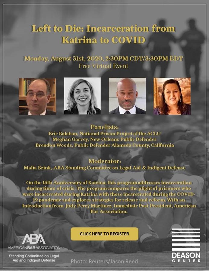 To mark the 15th Anniversary of Hurricane Katrina, the ABA Standing Committee on Legal Aid and Indigent Defense (SCLAID) together with the Deason Criminal Justice Reform Center at SMU Dedman School of Law, the ABA Criminal Justice Section and the ABA Section on Civil Rights and Social Justice present webinars on the impact of crisis on two key components of the criminal justice system: Jails and Prisons, and Public Defense. The programs will consider what happens to people trapped in the criminal justice system during times of extreme systemic stress and whether such times of crisis can be catalysts for reform.