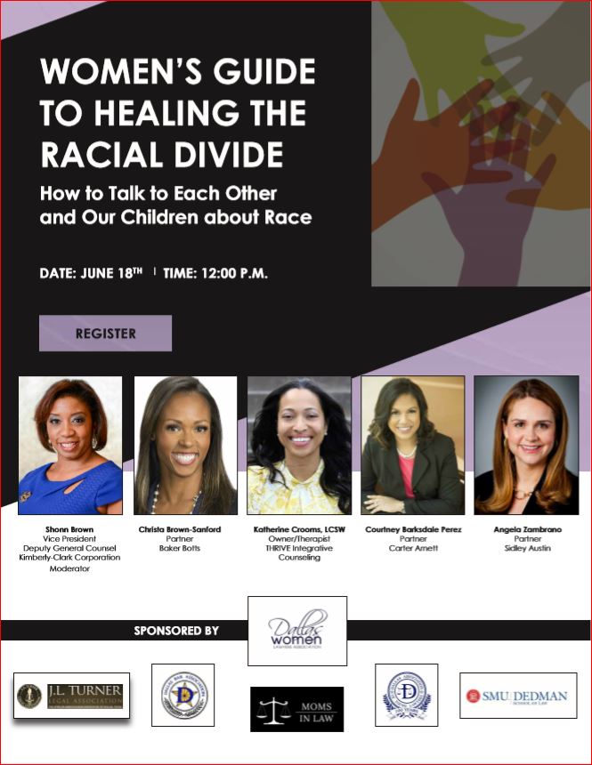 SMU Dedman Law is honored to partner with Dallas Women Lawyers Association, Dallas Bar Association, J.L. Turner Legal Association, Dallas Association of Young Lawyers, and Moms in Law on an upcoming conversation related to racism and discrimination open to both lawyers and law students (with or without children). Join us for a Zoom panel webinar on Thursday, June 18th from 12:00-1:00 p.m., titled Women’s Guide to Healing the Racial Divide: How to Talk to Each Other and Our Children about Race, which features three of our alumnae.