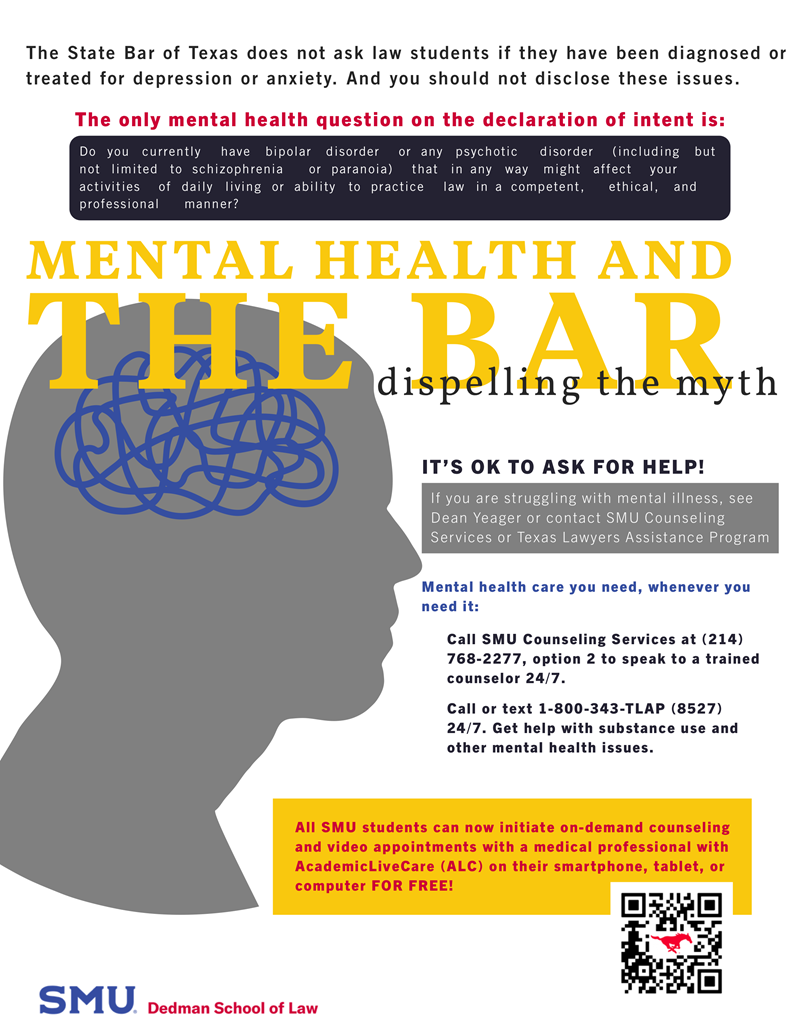 The Texas Lawyers Assistance Program provides confidential support to law students and graduates struggling with anxiety, depression, substance use issues, grief, or any mental health challenge. TLAP can be reached anytime at 1-800-343-TLAP or by texting TLAP to 555888. It can provide connection to mental health professionals, peer support, group support, and even financial assistance for mental health care. TLAP recently produced a program for law students and graduates dealing with the anxiety of the COVID-19 isolation and it can be viewed here All communications with TLAP are confidential pursuant to Texas Health & Safety Code § 467. TLAP does not share any information from law students seeking help from TLAP with non-TLAP third parties, the State Bar of Texas, the Texas Board of Law Examiners, the Chief Disciplinary Counsel’s Office, or any other disciplinary agency or entity. TLAP is staffed by attorneys who have spent many years struggling with addiction and depression, and their team protects the people they care about most, those seeking help!