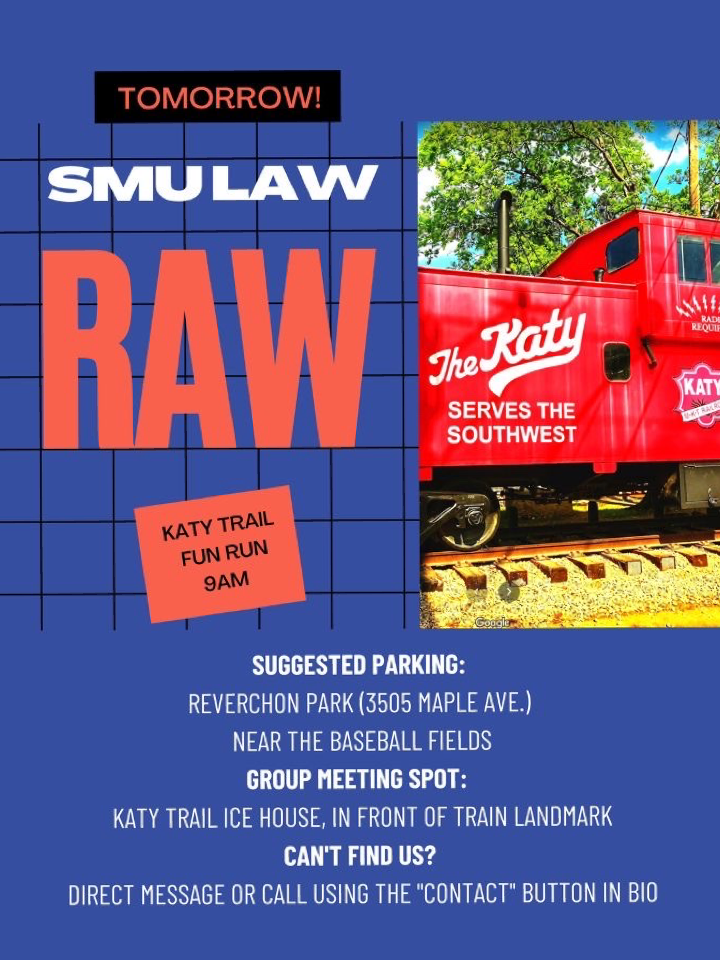 - Katy Trail Fun Run – Led by SMU Law Running and Walking Club. Gather at Katy Trail Ice House at 9 am to begin the run/walk. Gather back at the Katy Trail Ice House for a post-run cool down around 10:15 am. Sponsored by Akin Gump.