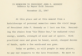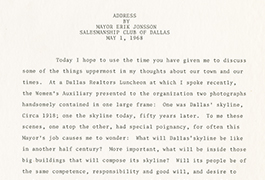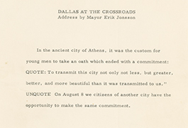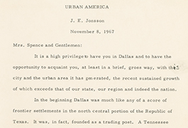 J. Erik Jonsson (1901-1995) was a man driven to change Dallas for the better. He served as Chairman of Texas Instruments (1958-1966), was elected Dallas Mayor (1964-1971), and was prominent in civic affairs. The J. Erik Jonsson papers, 1881-1995 (bulk 1964-1995) contain primarily his paper records, with some photographs, audiovisual materials and awards.