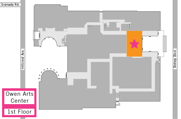 The naturally lit, glass-filled Gene and Jerry Jones Grand Atrium provides an intriguing visual backdrop for various performances and events, both formal and informal. Located at the Bishop Boulevard entrance to the Owen Arts Center, the atrium offers access to performing arts spaces like Caruth Auditorium and the Bob Hope Theatre, as well as gallery spaces like the Jordan Student Gallery and the Meadows Foundation Gallery.