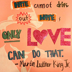 Student Anam Hadwani (B.B.A. Marketing, ’15, with minors in art and advertising) chose the Martin Luther King Jr. quote, "Hate cannot drive out hate; only love can do that" because, she says, “It showed me the true immensity of power that comes from spreading love.”