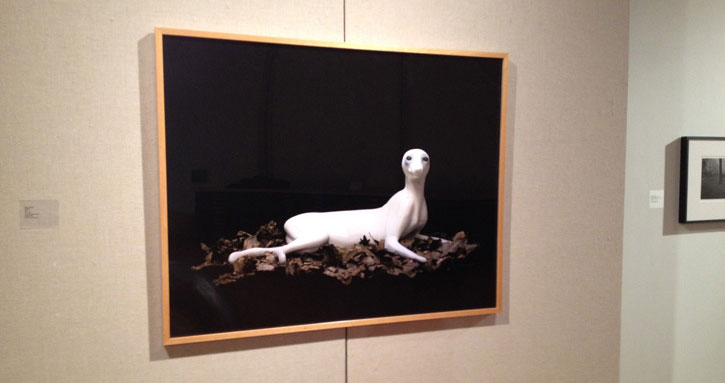 Walking into the gallery, one can’t help but notice the haunting image on the far wall. Misty Keasler’s Untitled is a rich-toned but curious image of a bone-white… dog? seal? fantastical creature? Its soulful dark eyes seem to look back at you, drawing you in. The piece is an archival pigment photograph of carefully constructed polyurethane foam, inspired by Keasler’s fascination with taxidermy. Normally used as the structure on which taxidermists would drape animal fur, Keasler’s foam creature is simultaneously real and unreal.