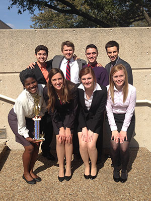 SMU Mock Trial’s Red and Blue teams proved victorious at the Dallas Regional Mock Trial Competition, hosted by the University of Texas at Dallas Feb. 14-16. With no losses and an impressive 7-0-1 record, the Red Team snagged second place among 21 competing teams, while the Blue Team took sixth place with five wins. In addition, SMU Mock Trial received three individual awards. From the Red Team, Haley High received an Outstanding Attorney Award and Kaitlin Wetz received an Outstanding Witness Award. From the Blue Team, Katherine Montgomery received an Outstanding Witness Award.