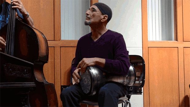 Jamal Mohamed, Director of the Meadows World Ensemble and Percussion Instructor, performs in the atrium for one of many, effusively spontaneous performances.