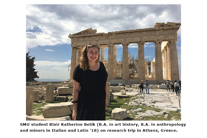Blair Katherine Betik (B.A. in art history, B.A. in anthropology and minors in Italian and Latin ’18) will attend Oxford and then go on to Yale. Betik selected those institutions primarily due to their specific scholars in classical archaeology (see Betik’s story, “Launching from SMU to Oxford and Yale” on this page).