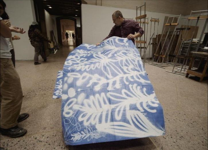 Artist Juan Negroni prepares one of his works for transport to the Regent Properties Professional Practice exhibition. Photo by Christian Vasquez.
