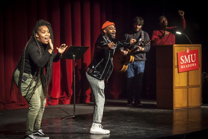 While waiting for the judges to determine the top three winners, the crowd was entertained by five SMU students. Temi George (B.A. English/Creative Writing; B.A. Corporate Communication and Public Affairs ’21) read one of her poems, Brief Prayer for a Brother, and Coda Boyce (B.F.A. Theatre ’20) performed a lively tap dance to Prince’s Kiss. Roderick Woodruff (B.F.A. Theatre ’19), Jasonica Moore (B.F.A. Theatre ’19) and Sami Habib (B.F.A. Theatre ’21) performed a selection of songs and invited competition participants to come up on stage and sing along.