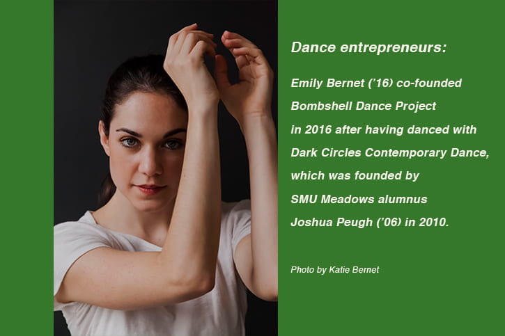 While at SMU Meadows, Emily Bernet danced professionally for Dark Circles Contemporary Dance, founded in 2010 by Meadows alumnus Joshua Peugh (’06). Bernet graduated in 2016 with a B.F.A. in dance performance and a minor in arts management. Shortly after graduation, while still dancing for Dark Circles and also teaching at Preston Dance Center, Bernet co-founded Bombshell Dance Project in Dallas. She knows first-hand the challenges of opening and running a business, and that there is much more to running a performing arts company than performing onstage.