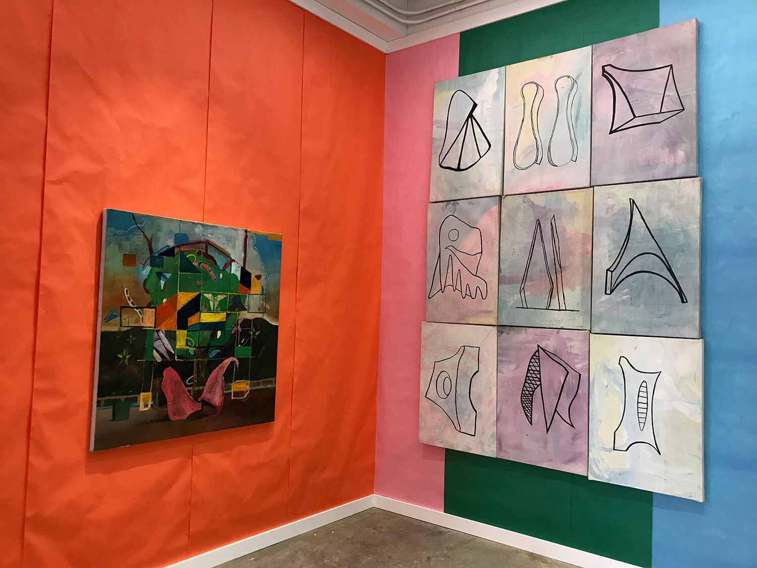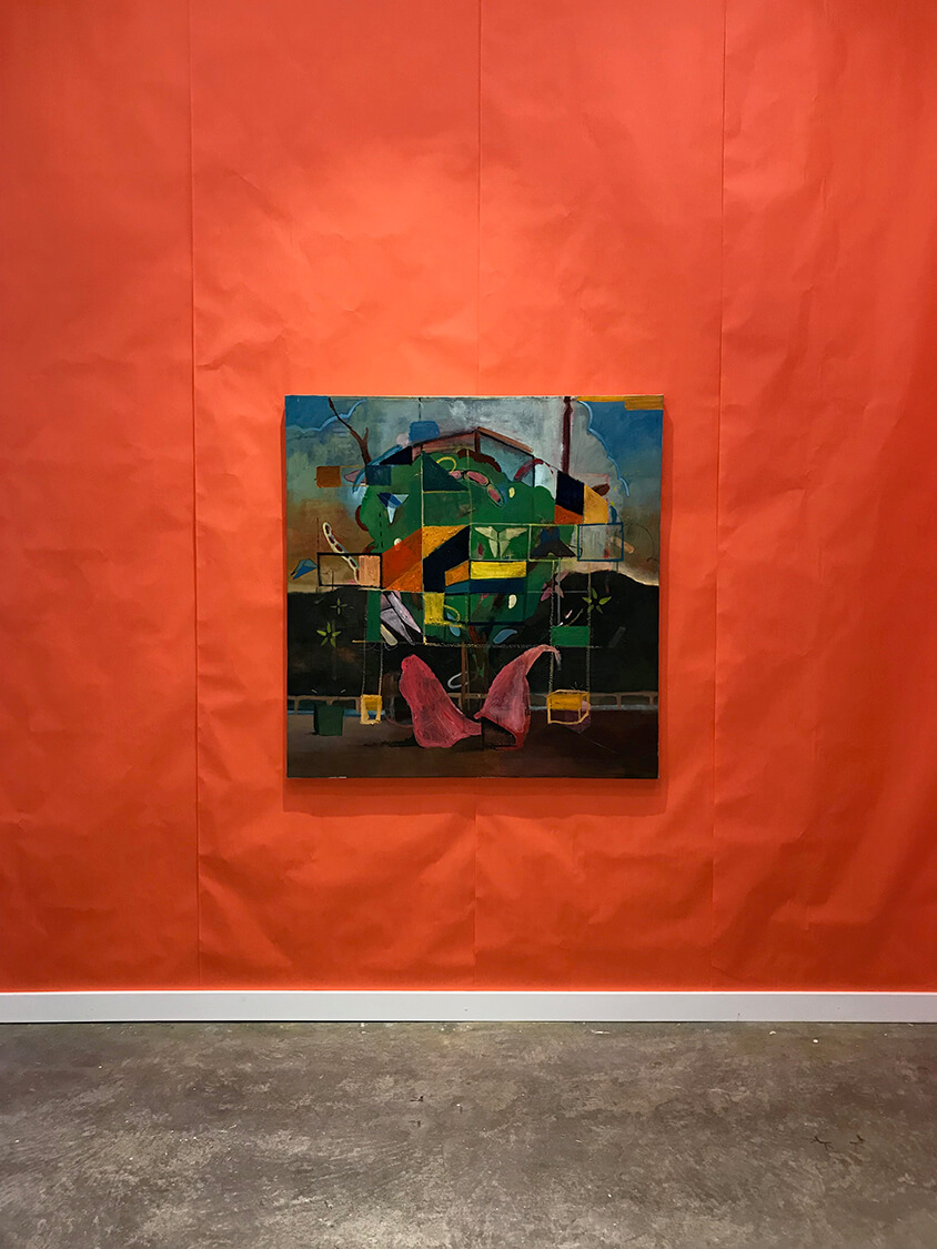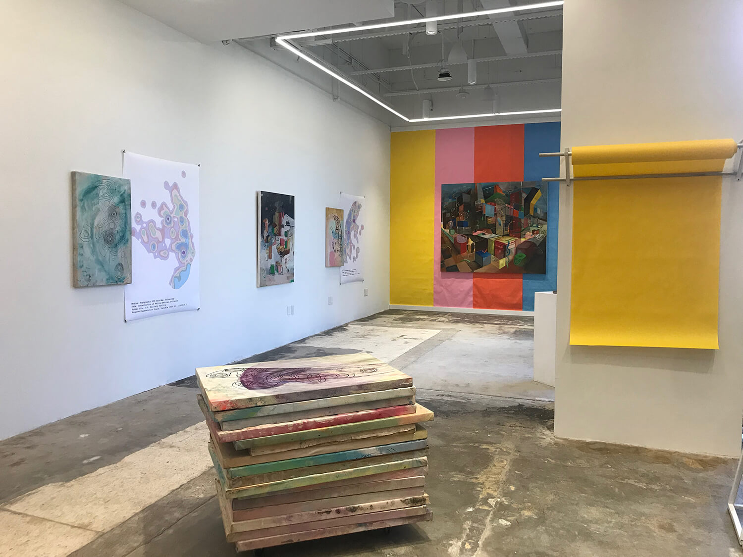 Villanueva is co-founder of Ash Studios, a community arts center near Fair Park where artists and local residents collaborate, experiment and explore cultural and political ideas. The show at the Pollock mirrors the collective nature of Ash Studios and the work that Cruz and Villanueva undertake there. The show features four paintings by Cruz and 11 by Villanueva, along with two Villanueva sculptures that are prototypes for public art projects. Two of Villanueva’s paintings are accompanied by digital topographic prints on paper that represent Indigenous archeological sites. The works embody the artists’ interest in the city as a space for collective learning and creation, particularly the making of art that is scalable and architecturally relevant, including murals and public art projects. Their works at the Pollock reflect on geography, three-dimensionality and accessibility.