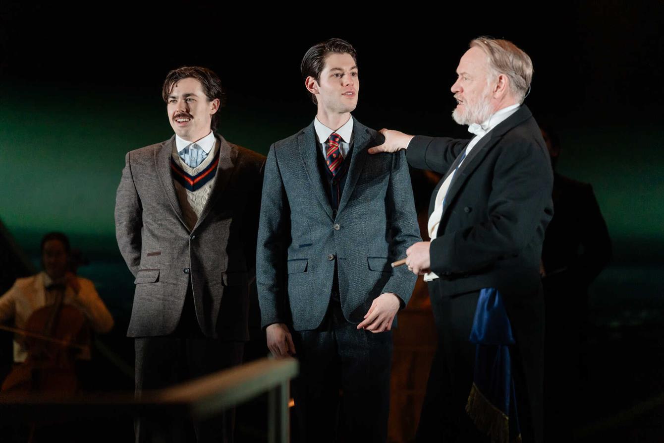 Martinez (center) acts opposite Jared Harris (right) and Chase Brown (left) as Guildenstern in RSC's 2024 production of "Hamlet." Photo by Ikin Yum.