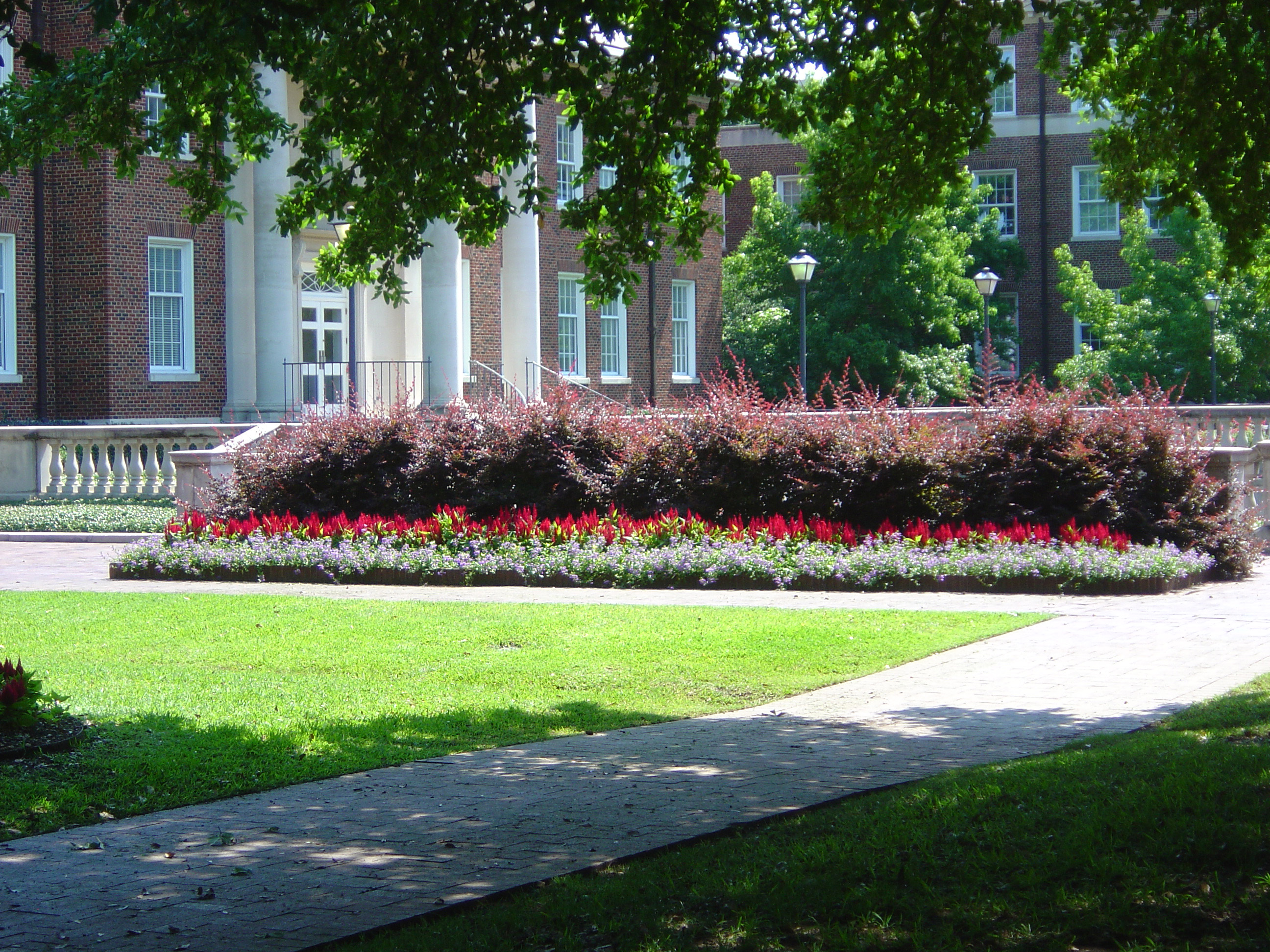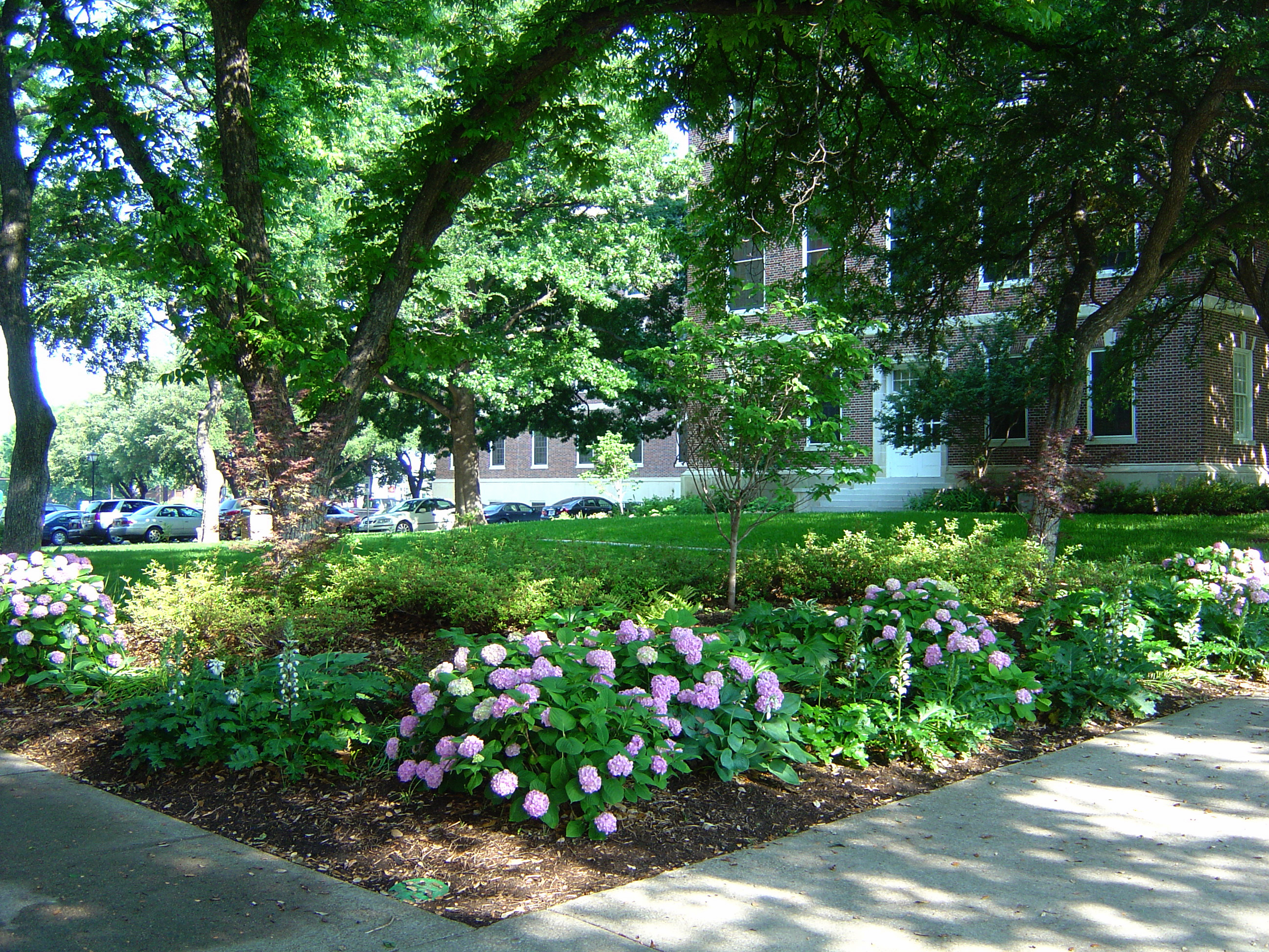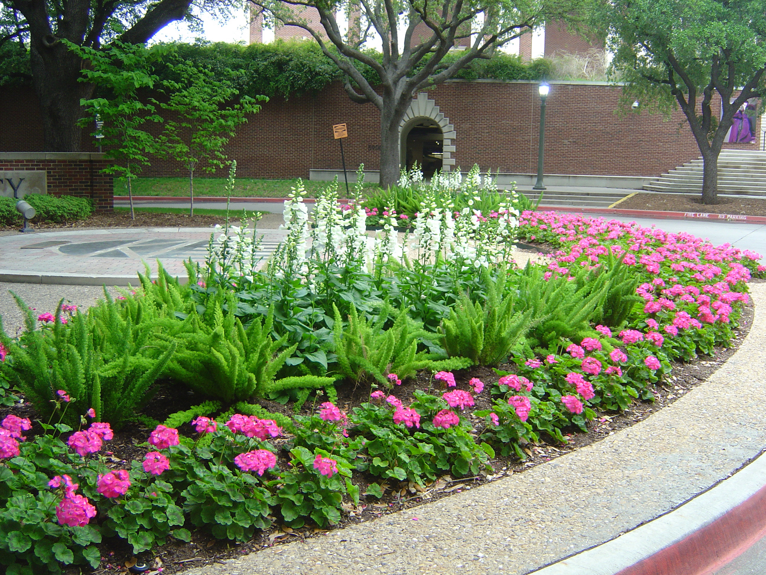 SMU colors of red and blue pansies fill the beds in winter while dogwood, hydrangea and daffodils bloom in the spring. Yellow star zinnias filled the beds all summer at the Laura Bush Promenade outside Fondren Library Center.