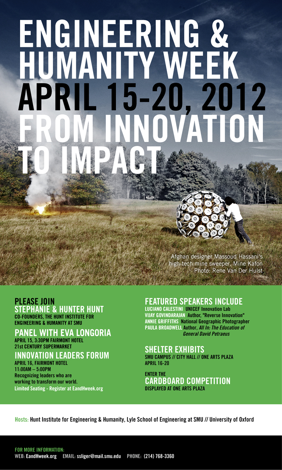 Engineering & Humanity Week calls attention to meeting the needs of the impoverished and displaced through technology and creativity. The week is built around SMU's Living Village, a collection of inexpensive but durable shelters for refugees and rapidly expanding urban populations, and a variety of speakers who advocate from a global perspective different approaches to improving living conditions for all.