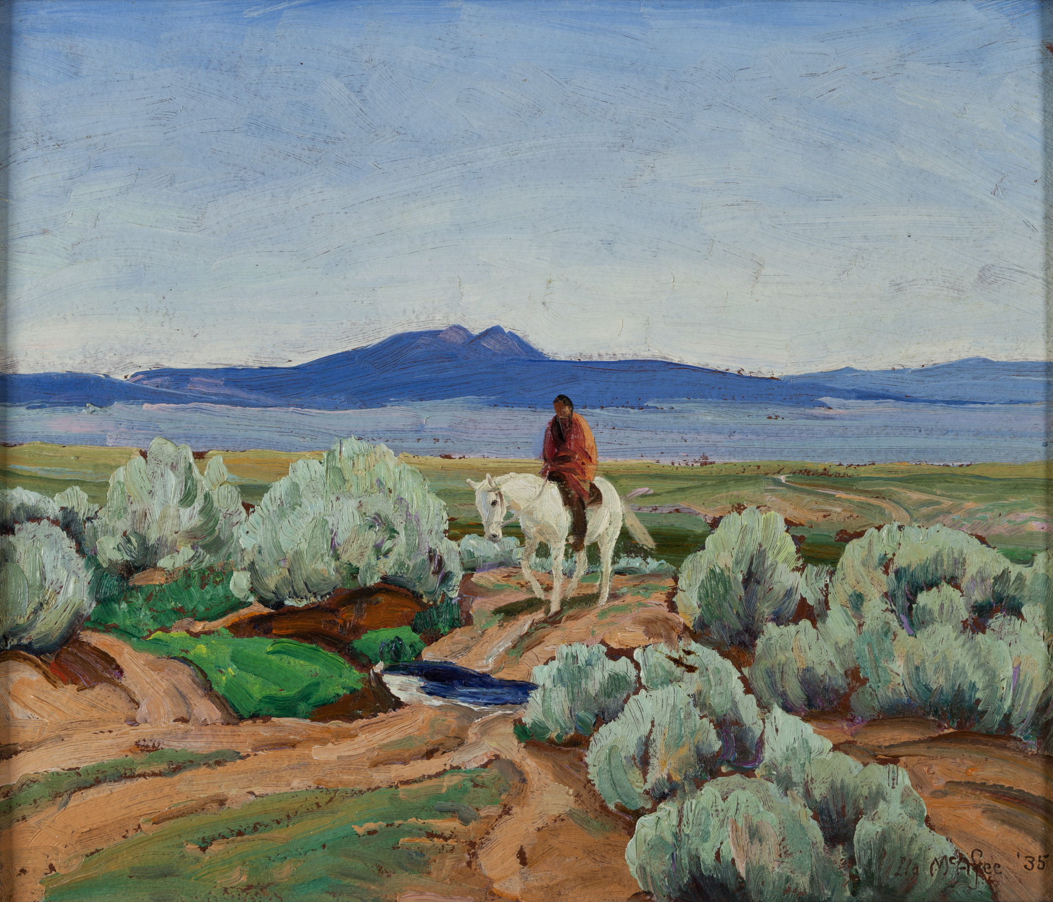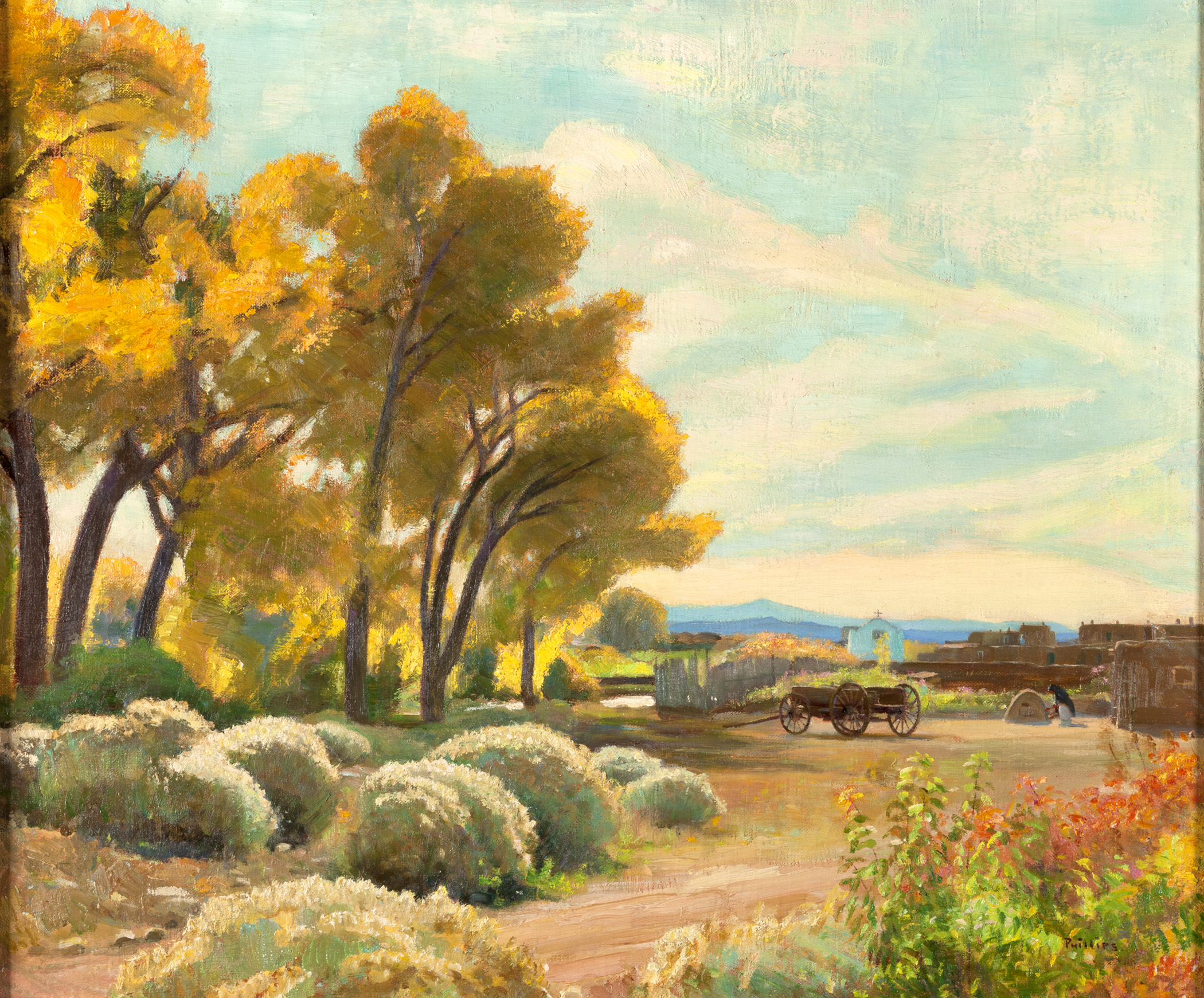 The exhibition includes oil paintings by Robert Julian Onderdonk, Elmer Page Turner, Ila McAfee, Bert Greer Phillips, Olin Travis and pastels by Frank Reaugh. Mrs. Ware had fond childhood memories of visiting with her parents the Taos studios of artists Bert Phillips, Ila McAfee and her husband Elmer Page Turner, as well as the Oak Cliff studio of Frank Reaugh.