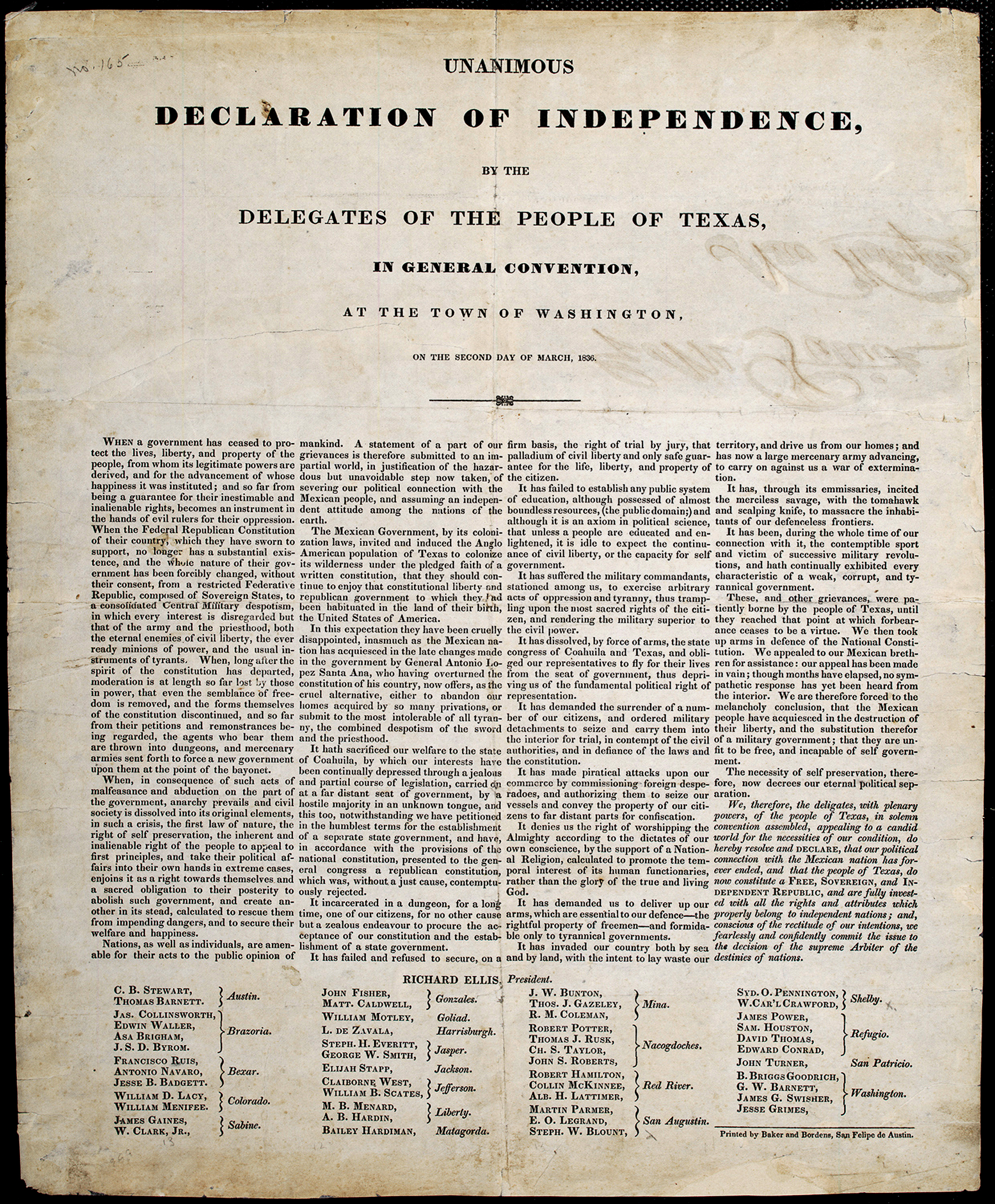 The Texas Declaration of Independence was adopted March 2, 1836, at Washington-on-the-Brazos. After it was signed by the 59 delegates to the convention, five copies were distributed to the towns of Bexar, Goliad, Nacogdoches, Brazoria and San Felipe. The printer at San Felipe was asked to print 1,000 copies to be distributed as handbills. The DeGolyer copy, acquired in 1984, is one of the surviving handbills (See below.)