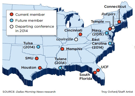 In 2014, East Carolina, Tulane and Tulsa jump on board as Louisville bolts to the ACC and Rutgers to the Big Ten. The U.S. Naval Academy will become a football-only member in 2015, increasing the league to 12 teams and setting the stage for a playoff game.