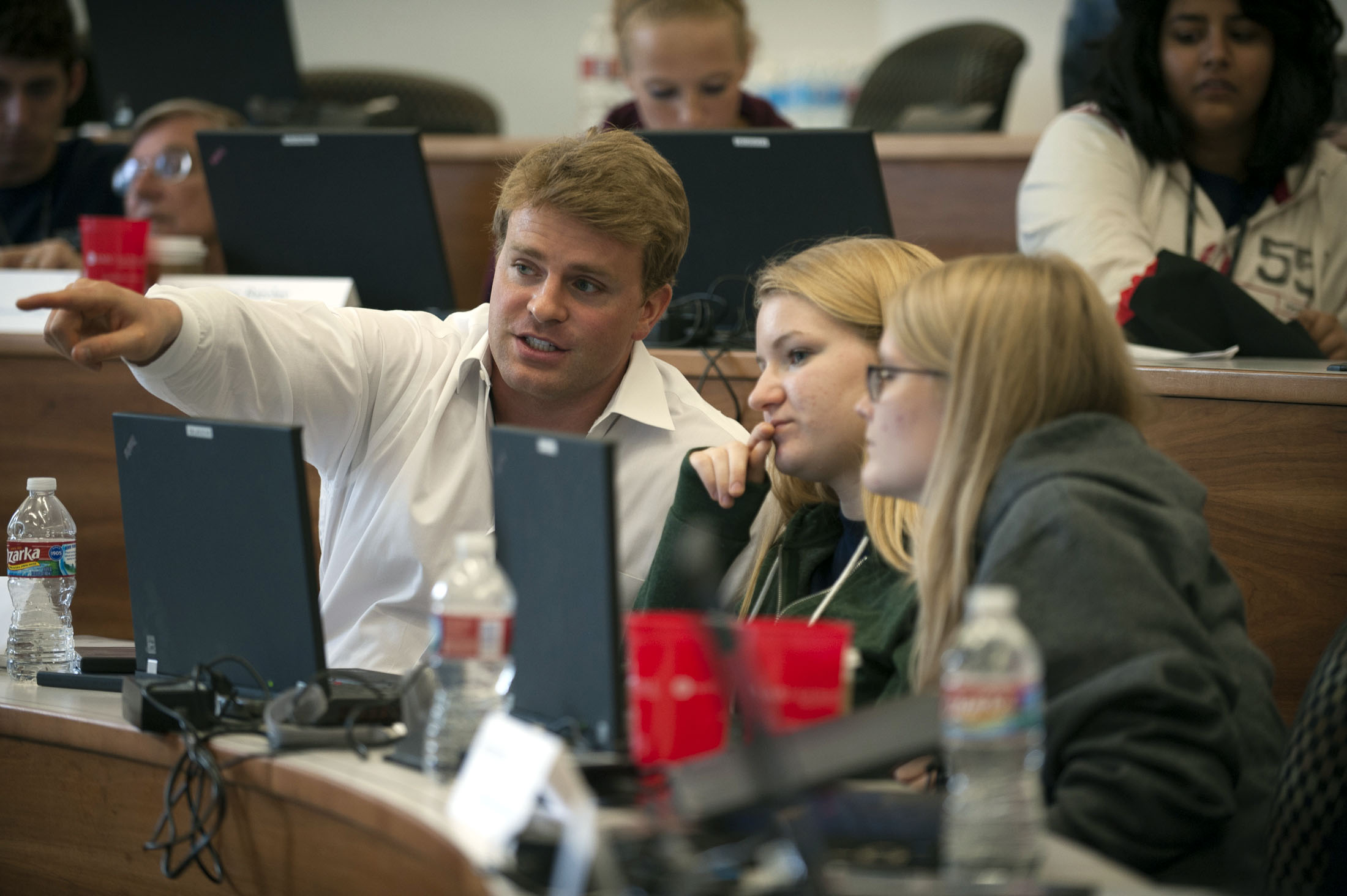 SMU Ph.D. student Michael Fulmer describes a feature of the IBM SPSS Modeler with students Briana Johnson and Becky Bell. |