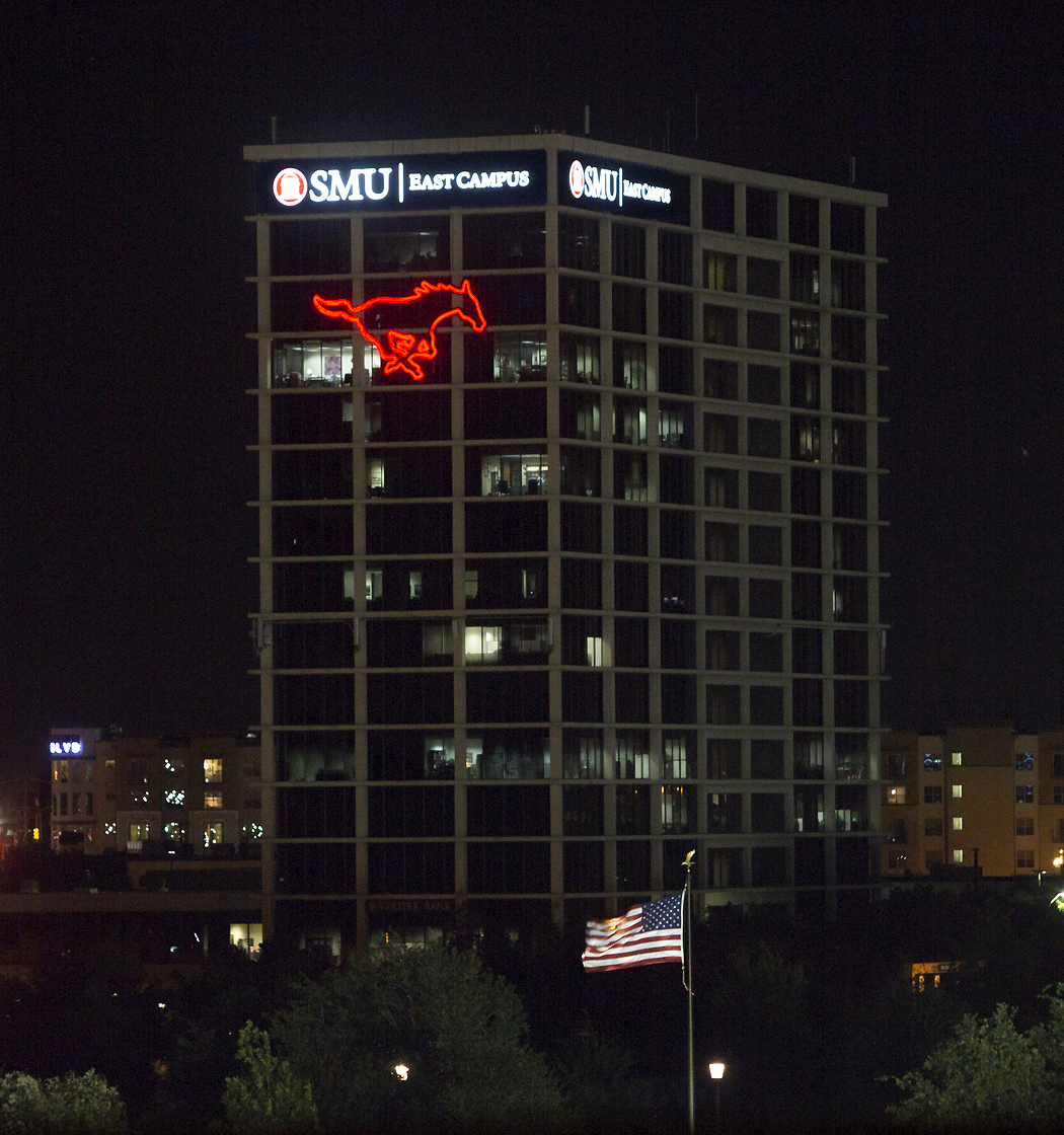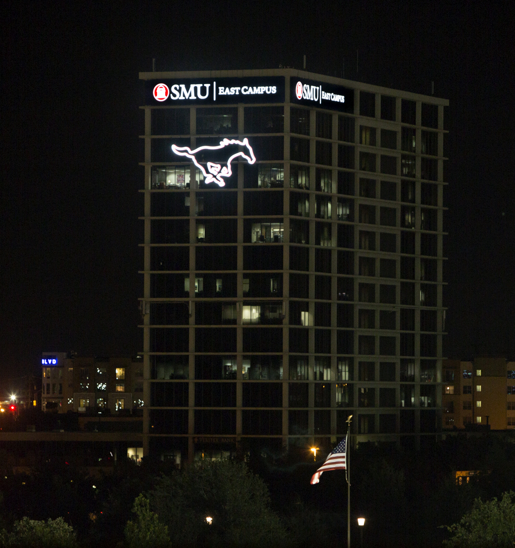 DALLAS (SMU) – A new SMU landmark – a three-story running SMU Mustang on the west side of Expressway Tower – began lighting night Nov. 13, 2014, the kick-off of SMU Homecoming Weekend.
