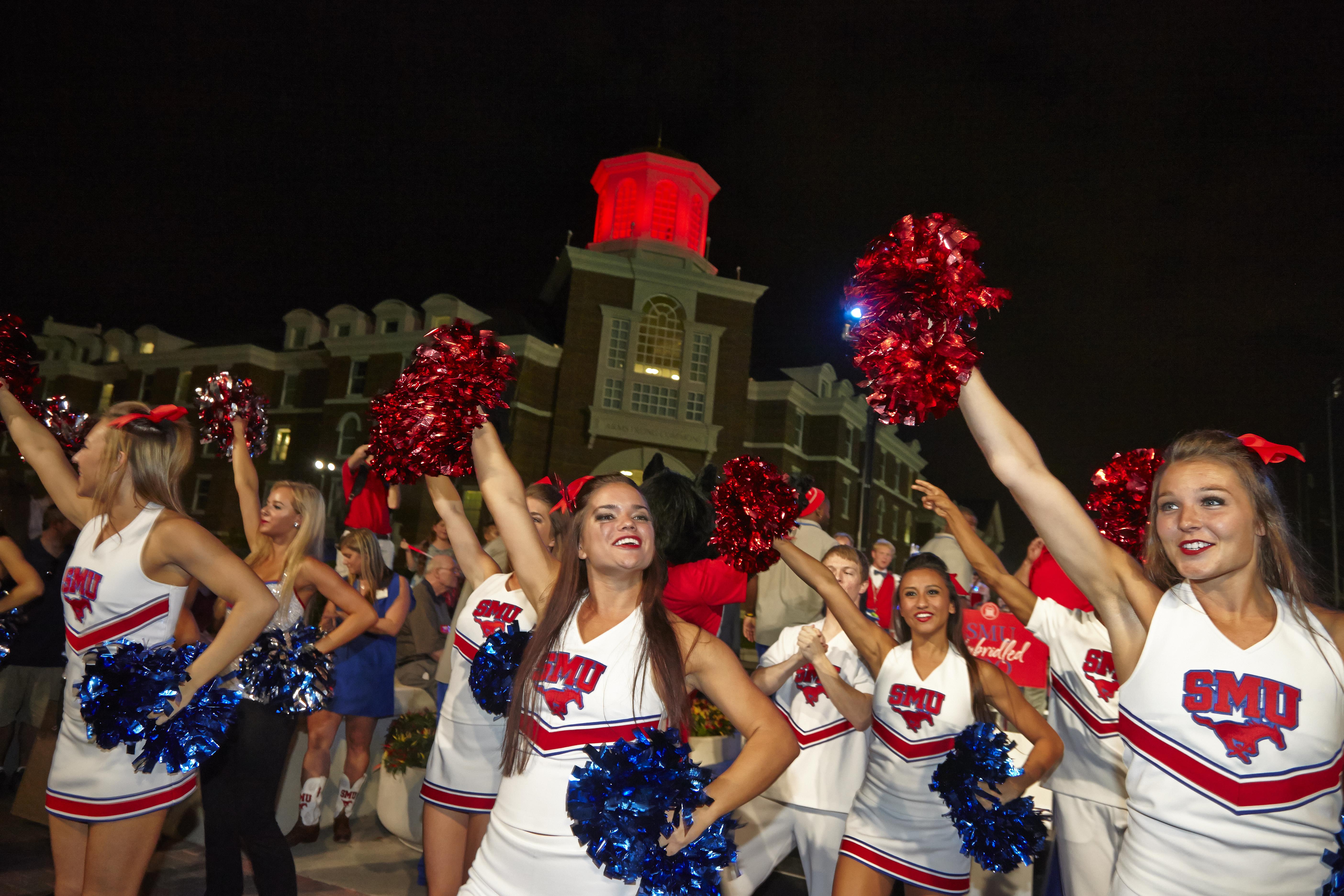 SMU cheerleaders and Peruna were on hand to welcome fans to the stampede on Mustang Mall, located east of Westcott Field between the Doak Walker Plaza and the Mustangs sculpture. The evening also featured food trucks, giveaways and special recognition of student and alumni donors. Mustangs and friends were encouraged to wear red SMU spirit wear.