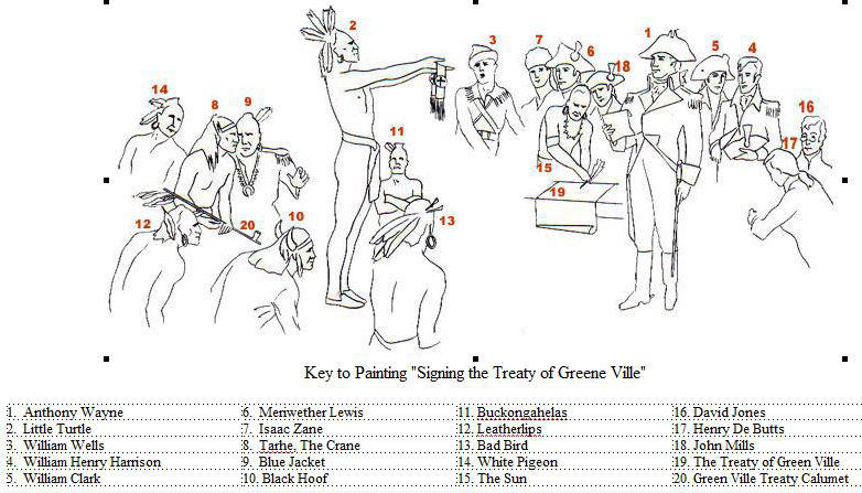 Both of Tony BlueJacket’s fifth great-grandfathers — revered Native American warriors from his paternal and maternal lines — are depicted in Howard Chandler Christy’s “Signing the Treaty of Greene Ville” painting commemorating the 1795 event: “BlueJacket” (in blue jacket and red sash at left of warrior standing with peace offering) and “Black Hoof” (second from bottom left). Also depicted are renowned explorers Meriwether Lewis (at left behind warrior signing treaty) and William Clark (standing second from right).