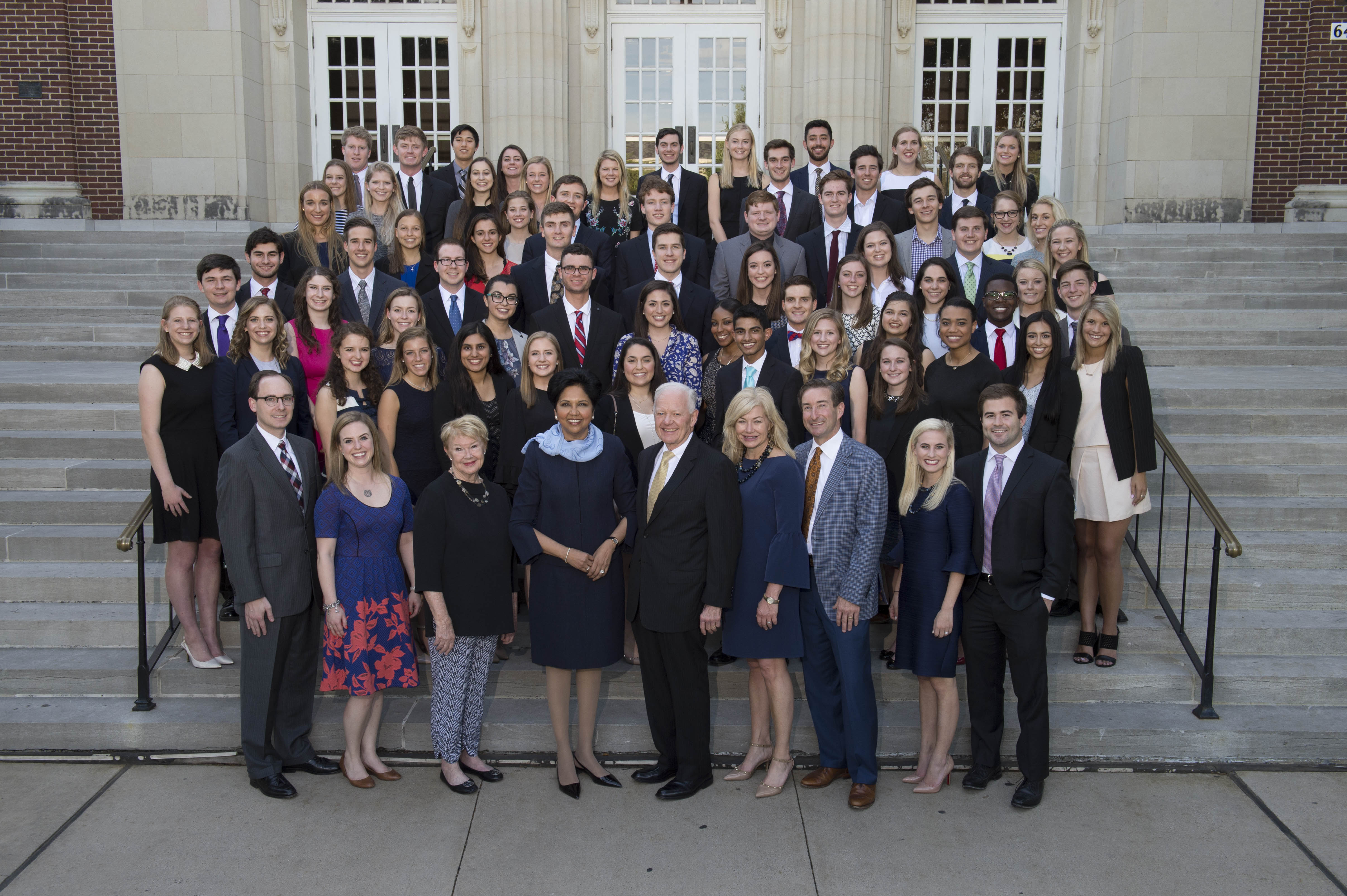 Nancy Ann Hunt (third from left, front row) and Ray L. Hunt (fifth from left, front row) with Hunt Leadership Scholars. |